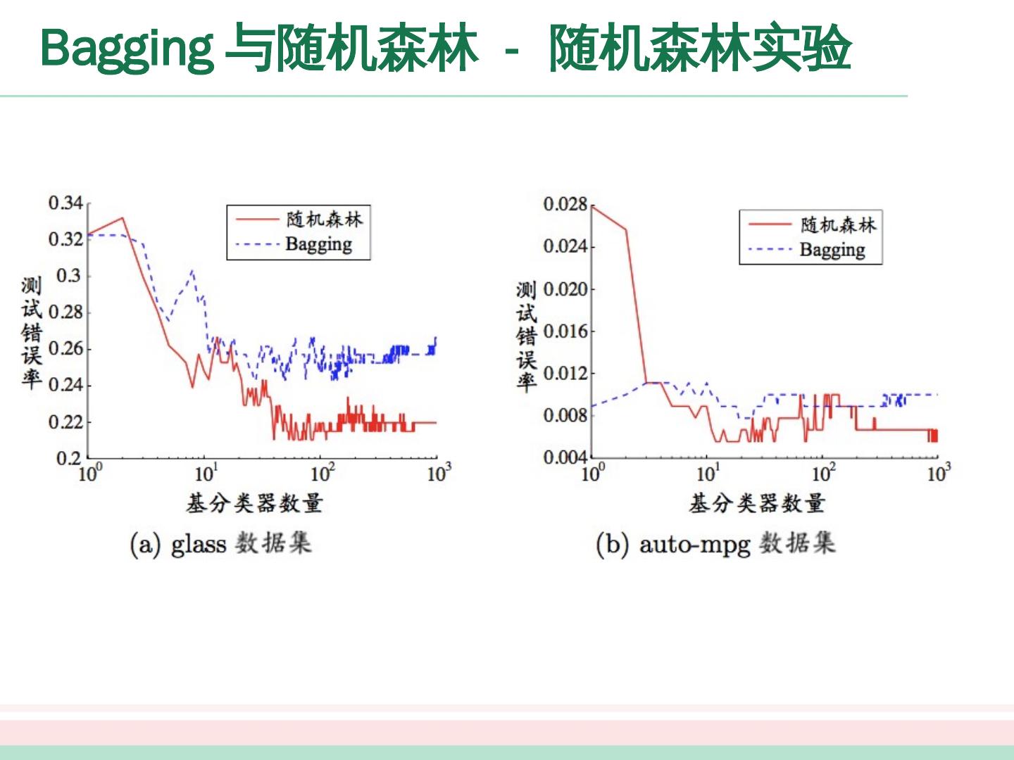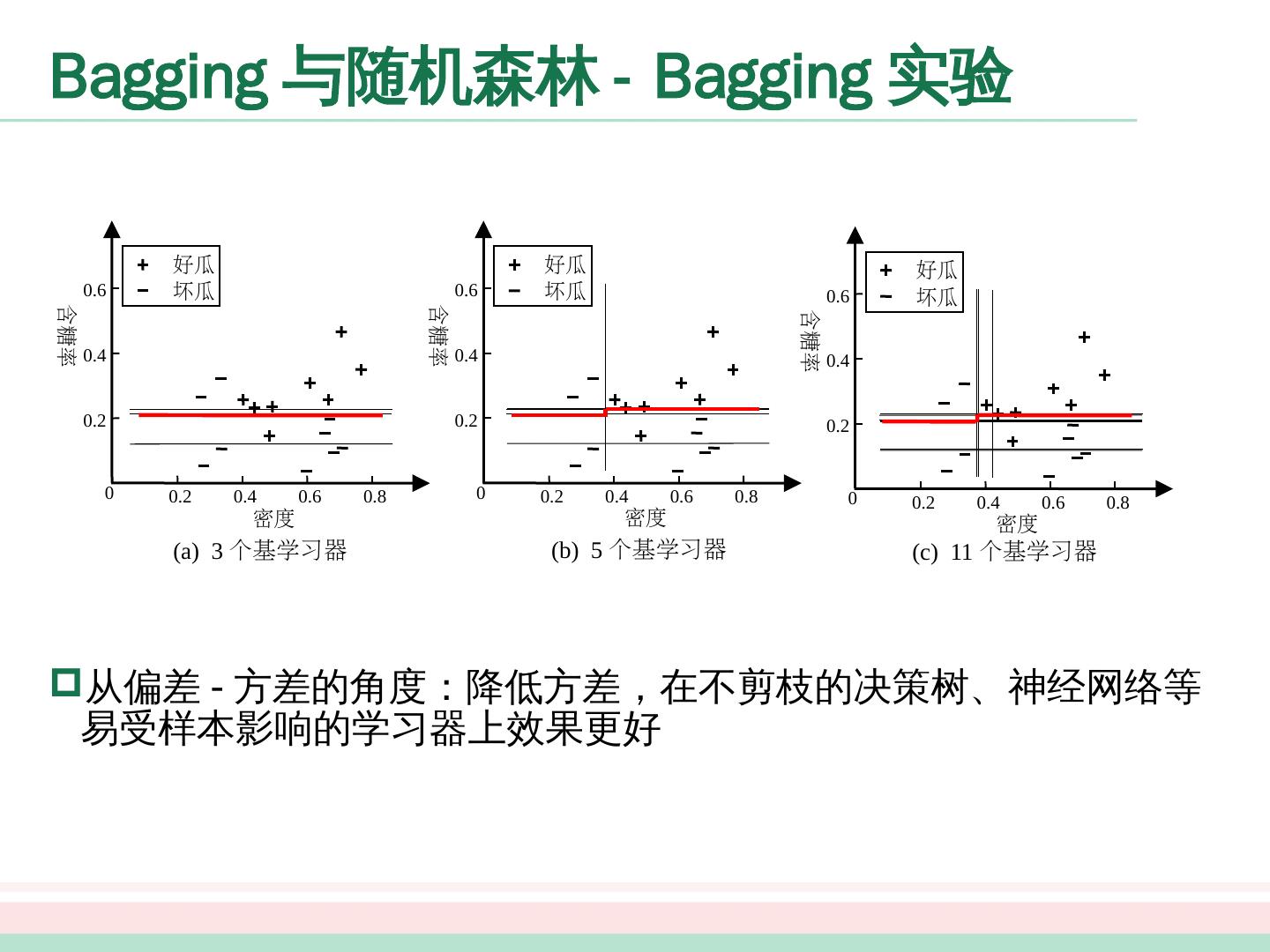 27 .0 0.2 0.4 0.6 0.8 0.2 0.4 0.6 好瓜 坏瓜 密度 含糖率 0 0.2 0.4 0.6 0.8 0.2 0.4 0.6 好瓜 坏瓜 密度 含糖率 0 0.2 0.4 0.6 0.8 0.2 0.4 0.6 好瓜 坏瓜 密度 含糖率 (a) 3 个基学习器 (b) 5 个基学习器 (c) 11 个基学习器 Bagging 与随机森林 - Bagging 实验 从偏差 - 方差的角度:降低 方差,在不剪枝的决策树、神经网络等易受样本影响的学习器上效果更好