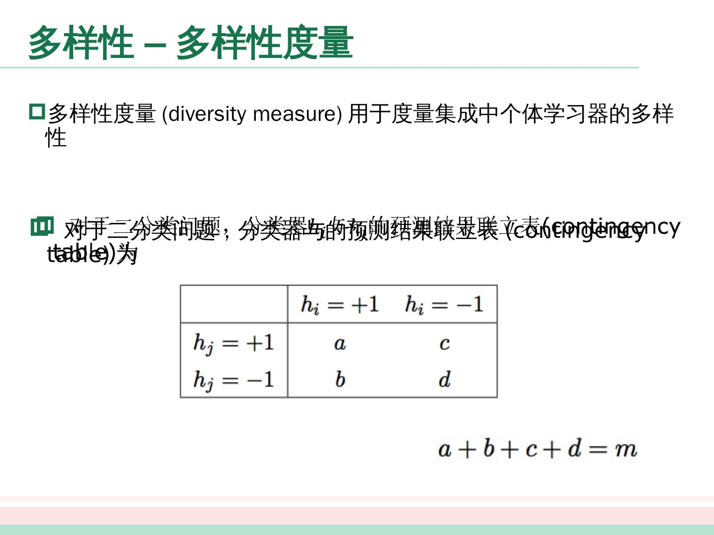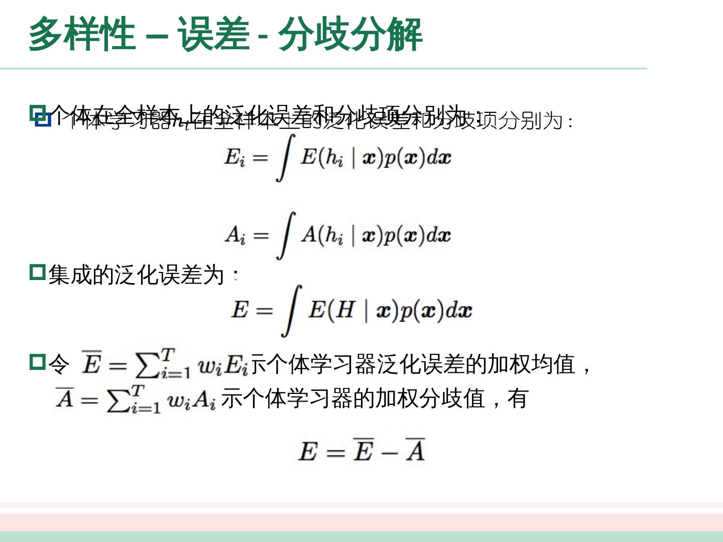 9 .个体与集成 – 简单分析 上面的分析有一个关键假设:基学习器的误差相互独立 现实任务中,个体学习器是为解决同一个问题训练出来的,显然不可能互相独立 事实上,个体学习器的“准确性”和“多样性”本身就存在冲突 如何产生“好而不同”的个体学习器是集成学习研究的核心 集成学习大致可分为两大类