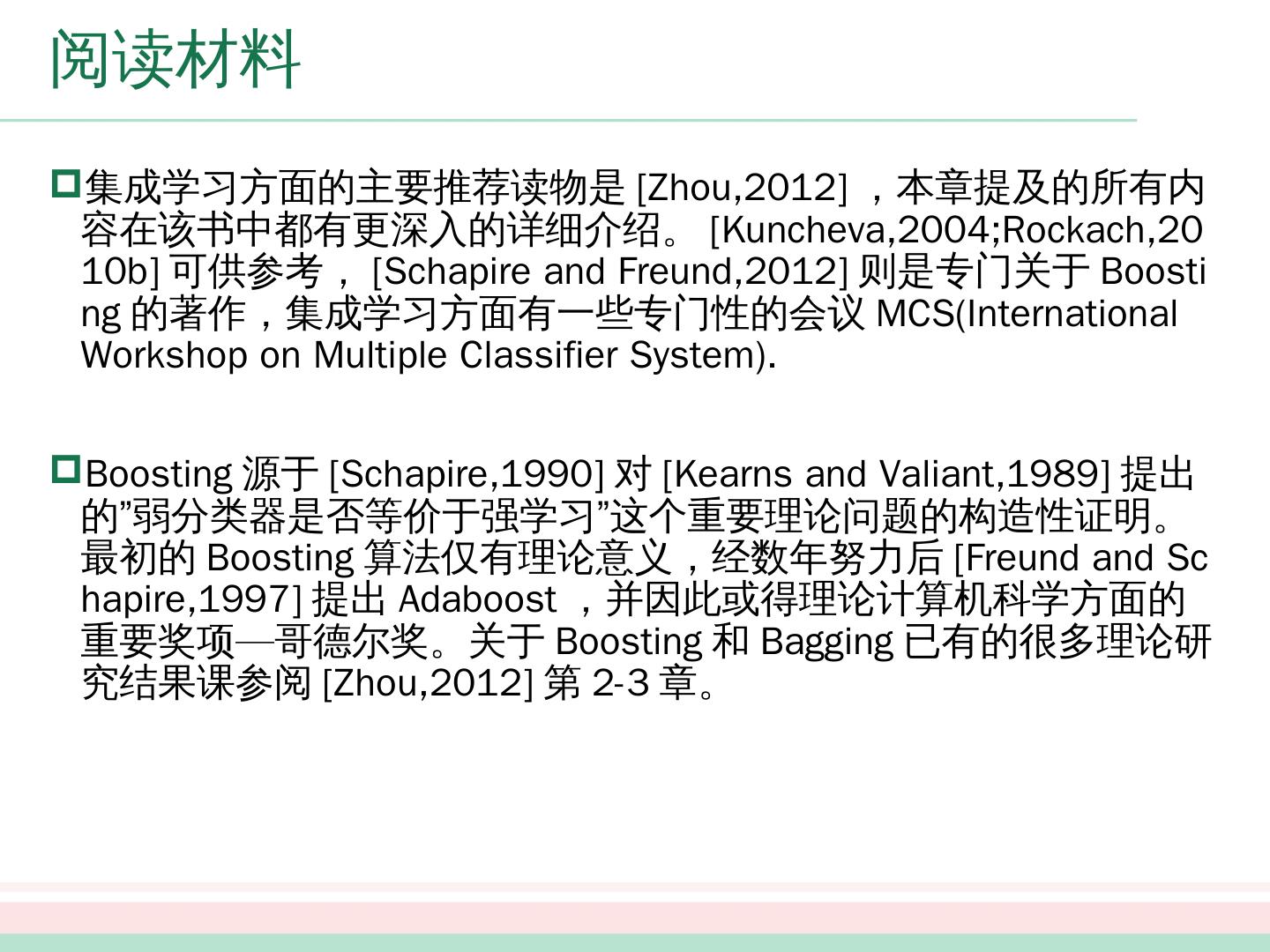 22 .0 0.2 0.4 0.6 0.8 0.2 0.4 0.6 好瓜 坏瓜 密度 含糖率 0 0.2 0.4 0.6 0.8 0.2 0.4 0.6 好瓜 坏瓜 密度 含糖率 0 0.2 0.4 0.6 0.8 0.2 0.4 0.6 好瓜 坏瓜 密度 含糖率 (a) 3 个基学习器 (b) 5 个基学习器 (c) 11 个基学习器 Boosting – AdaBoost 实验 从偏差 - 方差的角度:降低偏差,可对泛化性能相当弱的学习器构造出很强的集成