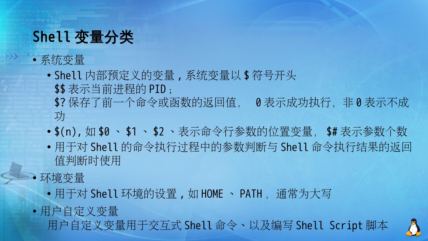 使用Shell变量可以增加Shell命令的灵活性,可以扩展命令功能. 方便用户编写Shell Script(Shell脚本),增加Shell脚本的灵活性与可扩展性,并使Shell脚本编程更有效. Shell变量分类. 系统变量. Shell内部预定义的变量,系统变量以$符号开头