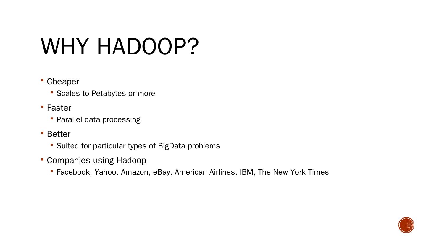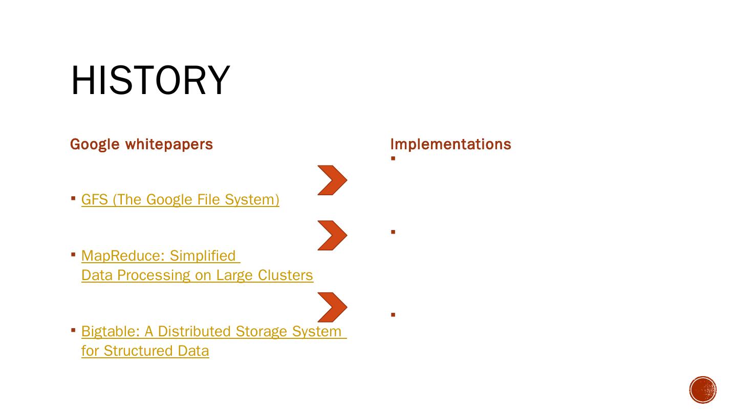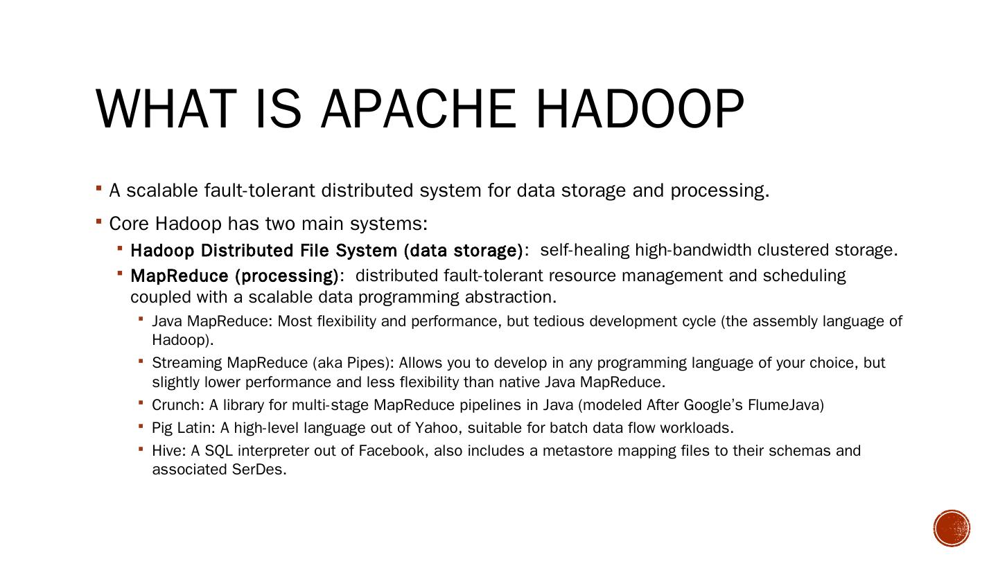 MapReduce. Apache HBase. history. What is apache hadoop. A scalable fault-tolerant distributed system for data storage and processing. Core Hadoop has two ...