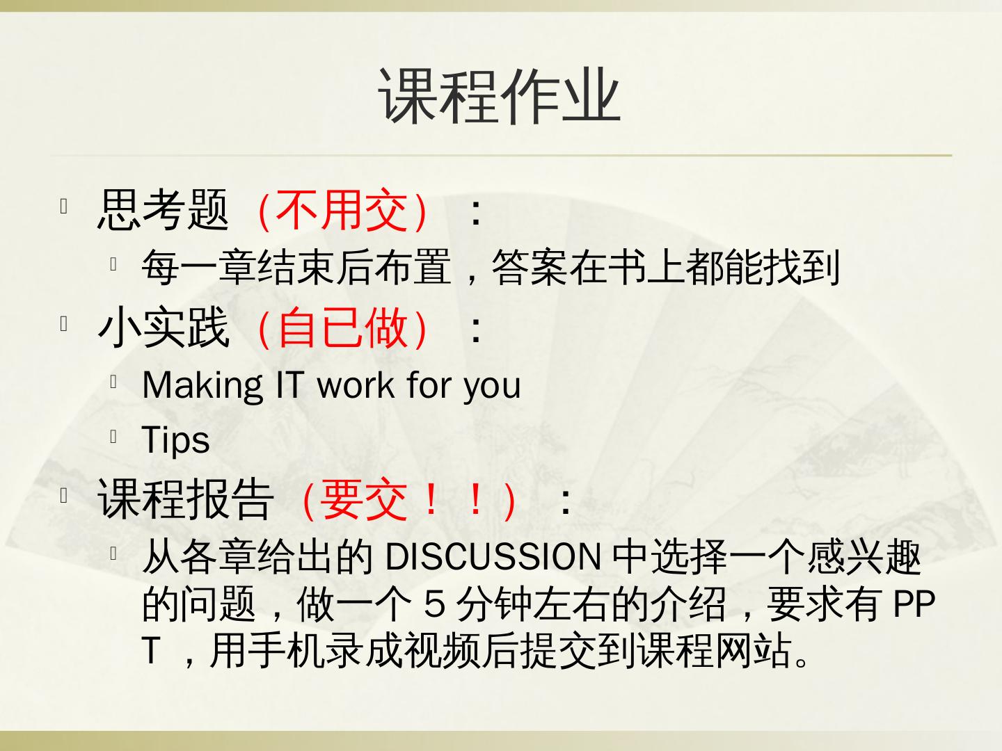 5 . 课程作业 思考题(不用交): 每一章结束后布置,答案在书上都能找到 小实践(自已做): Making IT work for you Tips 课程报告(要交!!): 从各章给出的 DISCUSSION 中选择一个感兴趣 的问题,做一个 5 分钟左右的介绍,要求有 PP T ,用手机录成视频后提交到课程网站。