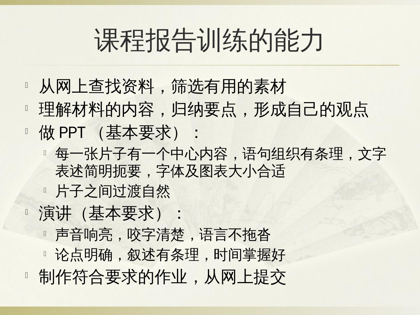 6 . 课程报告训练的能力 从网上查找资料,筛选有用的素材 理解材料的内容,归纳要点,形成自己的观点 做 PPT (基本要求): 每一张片子有一个中心内容,语句组织有条理,文字 表述简明扼要,字体及图表大小合适 片子之间过渡自然 演讲(基本要求): 声音响亮,咬字清楚,语言不拖沓 论点明确,叙述有条理,时间掌握好 制作符合要求的作业,从网上提交