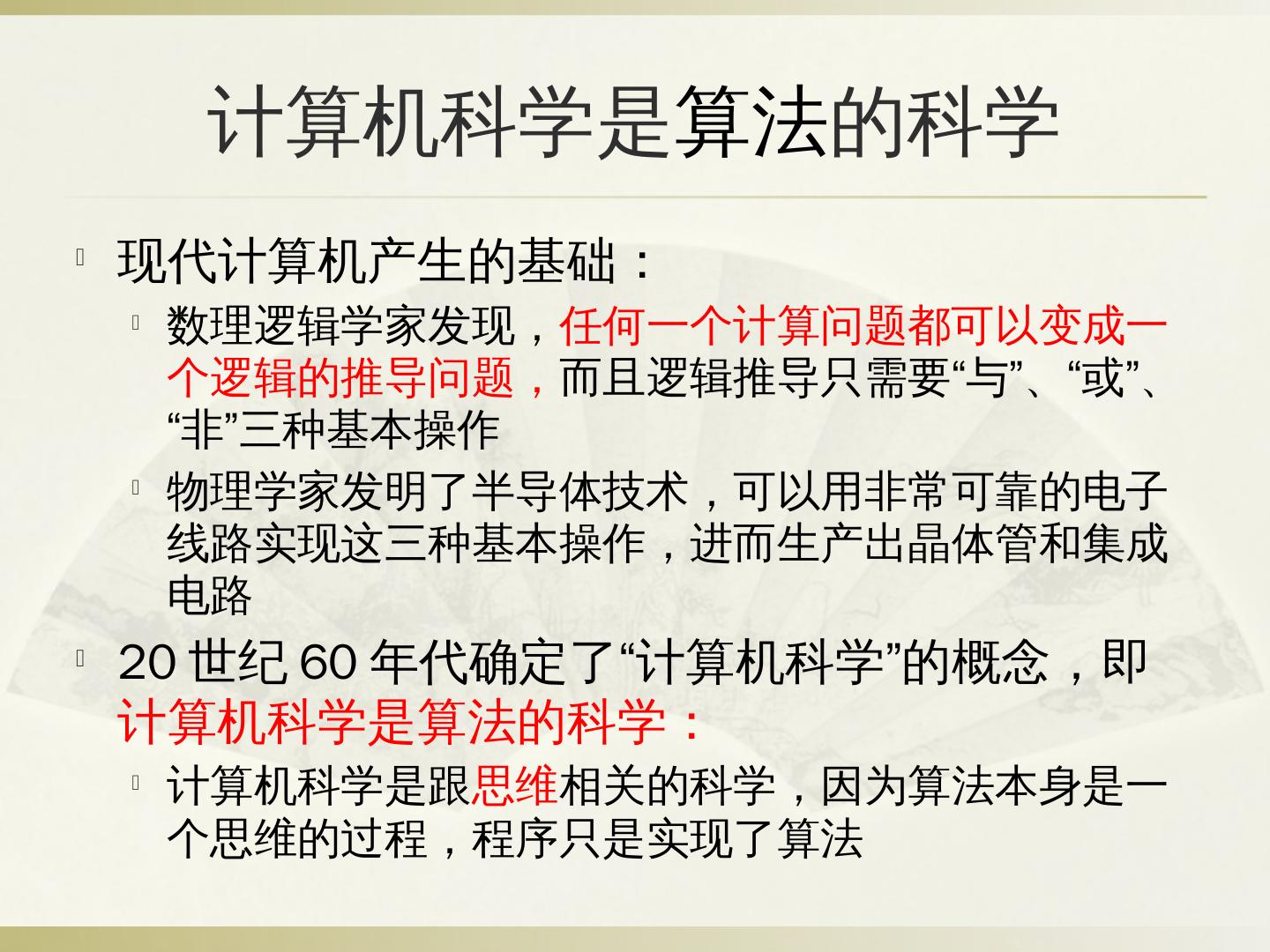 7 . 计算机科学是算法的科学 现代计算机产生的基础: 数理逻辑学家发现,任何一个计算问题都可以变成一 个逻辑的推导问题,而且逻辑推导只需要“与”、“或”、 “非”三种基本操作 物理学家发明了半导体技术,可以用非常可靠的电子 线路实现这三种基本操作,进而生产出晶体管和集成 电路 20 世纪 60 年代确定了“计算机科学”的概念,即 计算机科学是算法的科学: 计算机科学是跟思维相关的科学,因为算法本身是一 个思维的过程,程序只是实现了算法