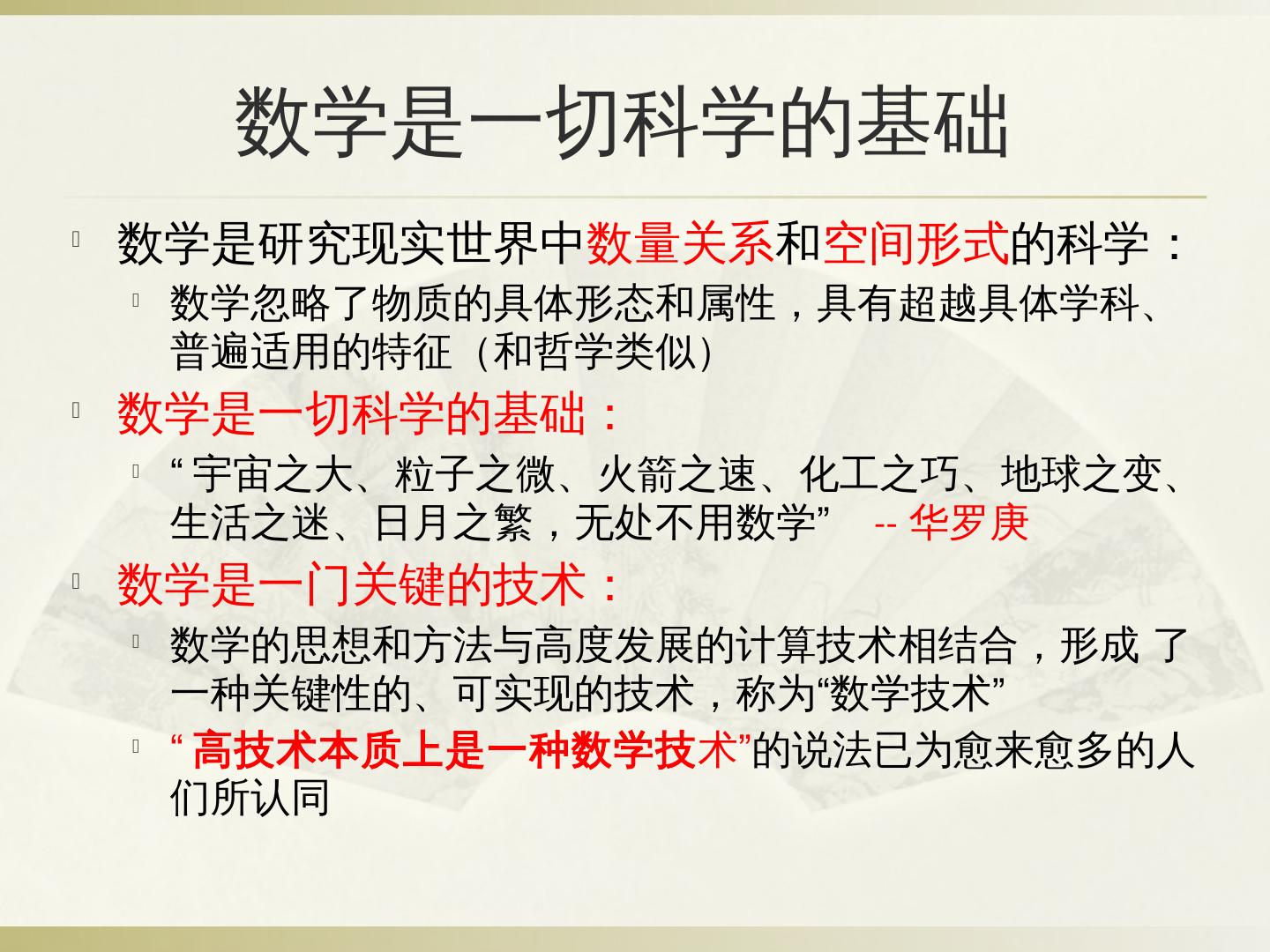 10 . 数学是一切科学的基础 数学是研究现实世界中数量关系和空间形式的科学: 数学忽略了物质的具体形态和属性,具有超越具体学科、 普遍适用的特征(和哲学类似) 数学是一切科学的基础: “ 宇宙之大、粒子之微、火箭之速、化工之巧、地球之变、 生活之迷、日月之繁,无处不用数学” -- 华罗庚 数学是一门关键的技术: 数学的思想和方法与高度发展的计算技术相结合,形成 了 一种关键性的、可实现的技术,称为“数学技术” “ 高技术本质上是一种数学技术”的说法已为愈来愈多的人 们所认同