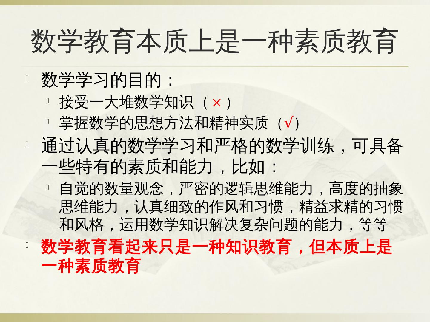 11 . 数学教育本质上是一种素质教育 数学学习的目的: 接受一大堆数学知识( × ) 掌握数学的思想方法和精神实质(√) 通过认真的数学学习和严格的数学训练,可具备 一些特有的素质和能力,比如: 自觉的数量观念,严密的逻辑思维能力,高度的抽象 思维能力,认真细致的作风和习惯,精益求精的习惯 和风格,运用数学知识解决复杂问题的能力,等等 数学教育看起来只是一种知识教育,但本质上是 一种素质教育