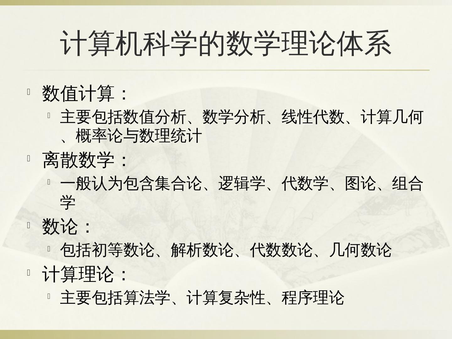 13 . 计算机科学的数学理论体系 数值计算: 主要包括数值分析、数学分析、线性代数、计算几何 、概率论与数理统计 离散数学: 一般认为包含集合论、逻辑学、代数学、图论、组合 学 数论: 包括初等数论、解析数论、代数数论、几何数论 计算理论: 主要包括算法学、计算复杂性、程序理论