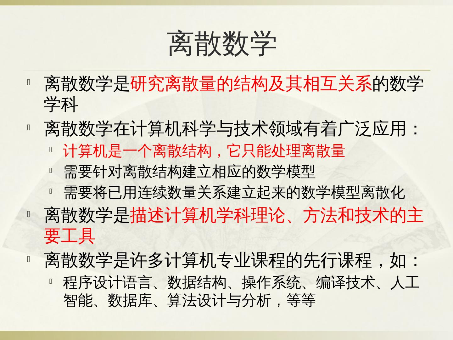 14 . 离散数学 离散数学是研究离散量的结构及其相互关系的数学 学科 离散数学在计算机科学与技术领域有着广泛应用: 计算机是一个离散结构,它只能处理离散量 需要针对离散结构建立相应的数学模型 需要将已用连续数量关系建立起来的数学模型离散化 离散数学是描述计算机学科理论、方法和技术的主 要工具 离散数学是许多计算机专业课程的先行课程,如: 程序设计语言、数据结构、操作系统、编译技术、人工 智能、数据库、算法设计与分析,等等