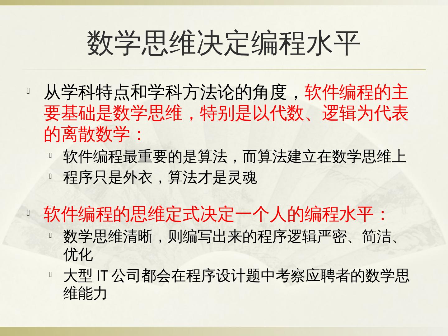 15 . 数学思维决定编程水平 从学科特点和学科方法论的角度,软件编程的主 要基础是数学思维,特别是以代数、逻辑为代表 的离散数学: 软件编程最重要的是算法,而算法建立在数学思维上 程序只是外衣,算法才是灵魂 软件编程的思维定式决定一个人的编程水平: 数学思维清晰,则编写出来的程序逻辑严密、简洁、 优化 大型 IT 公司都会在程序设计题中考察应聘者的数学思 维能力