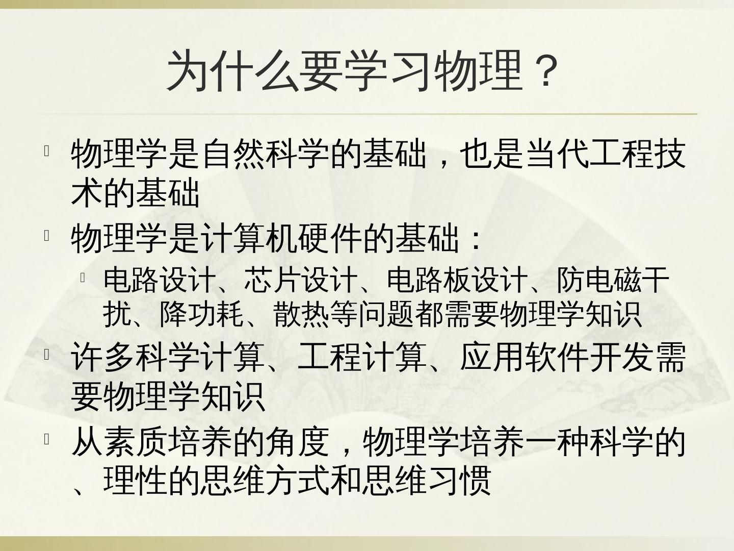18 . 为什么要学习物理? 物理学是自然科学的基础,也是当代工程技 术的基础 物理学是计算机硬件的基础: 电路设计、芯片设计、电路板设计、防电磁干 扰、降功耗、散热等问题都需要物理学知识 许多科学计算、工程计算、应用软件开发需 要物理学知识 从素质培养的角度,物理学培养一种科学的 、理性的思维方式和思维习惯