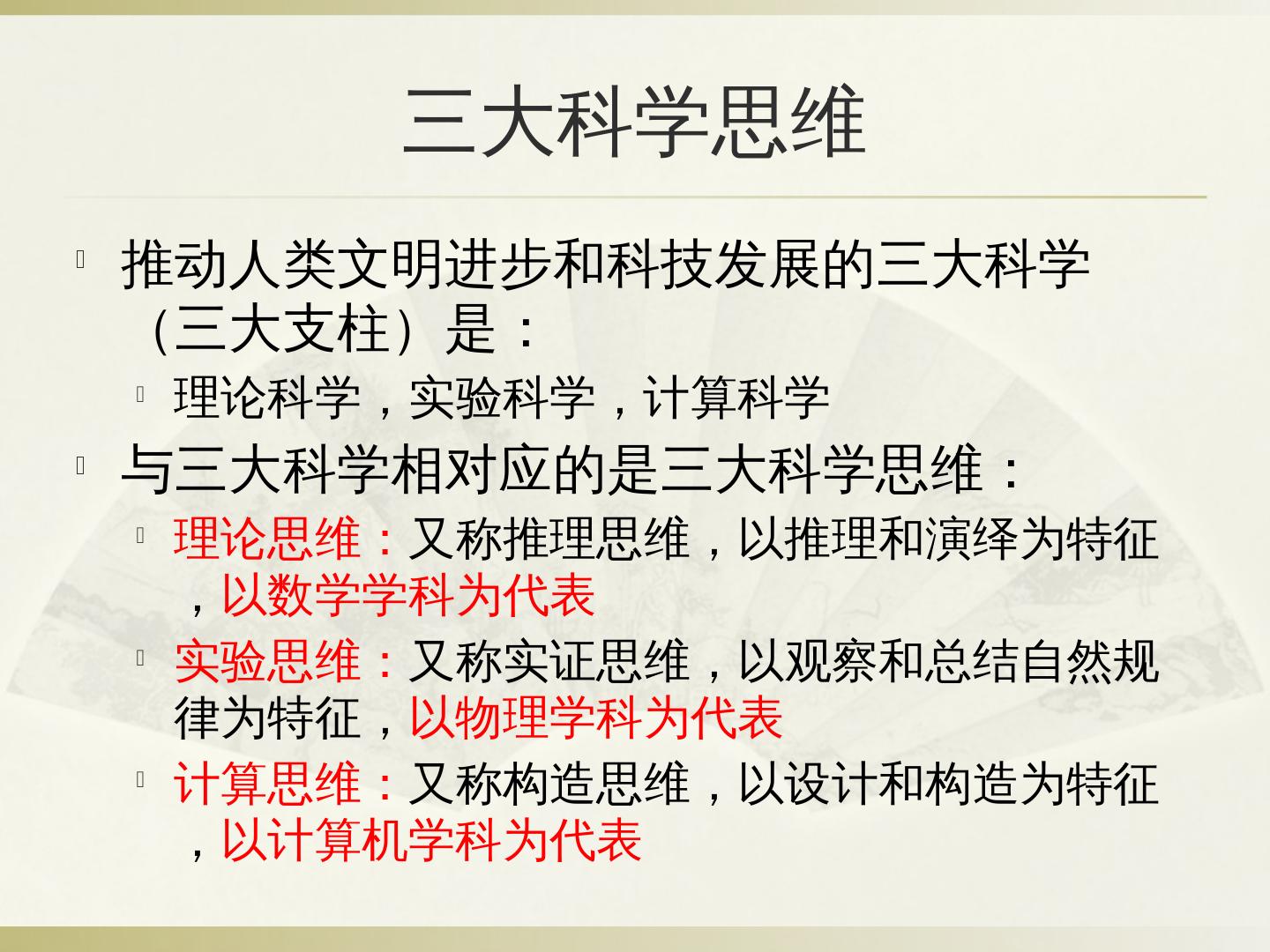 19 . 三大科学思维 推动人类文明进步和科技发展的三大科学 (三大支柱)是: 理论科学,实验科学,计算科学 与三大科学相对应的是三大科学思维: 理论思维:又称推理思维,以推理和演绎为特征 ,以数学学科为代表 实验思维:又称实证思维,以观察和总结自然规 律为特征,以物理学科为代表 计算思维:又称构造思维,以设计和构造为特征 ,以计算机学科为代表