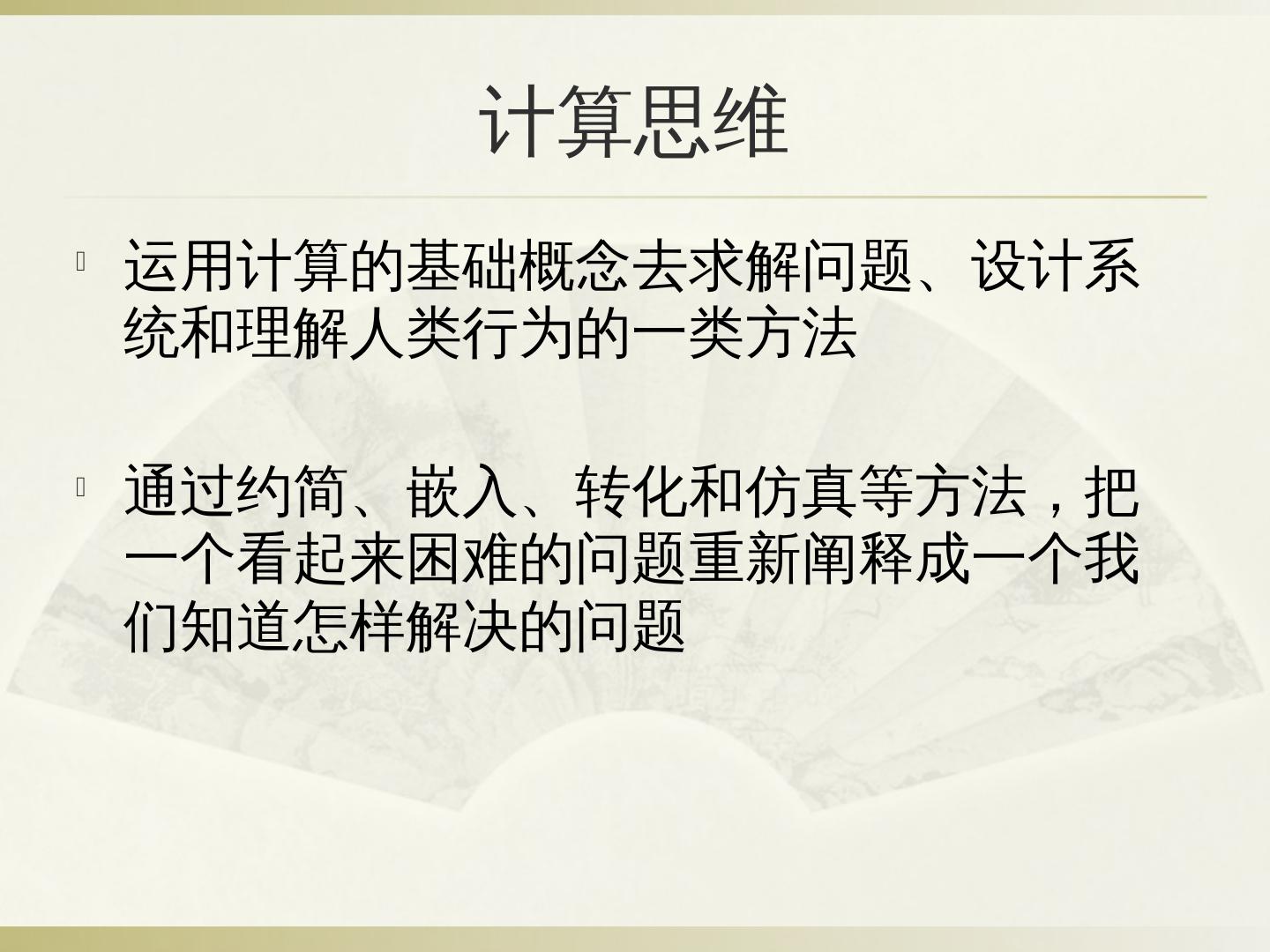 20 . 计算思维 运用计算的基础概念去求解问题、设计系 统和理解人类行为的一类方法 通过约简、嵌入、转化和仿真等方法,把 一个看起来困难的问题重新阐释成一个我 们知道怎样解决的问题