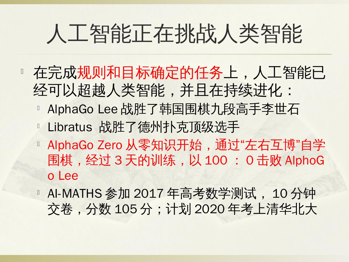 23 . 人工智能正在挑战人类智能 在完成规则和目标确定的任务上,人工智能已 经可以超越人类智能,并且在持续进化: AlphaGo Lee 战胜了韩国围棋九段高手李世石 Libratus 战胜了德州扑克顶级选手 AlphaGo Zero 从零知识开始,通过“左右互博”自学 围棋,经过 3 天的训练,以 100 : 0 击败 AlphoG o Lee AI-MATHS 参加 2017 年高考数学测试, 10 分钟 交卷,分数 105 分;计划 2020 年考上清华北大
