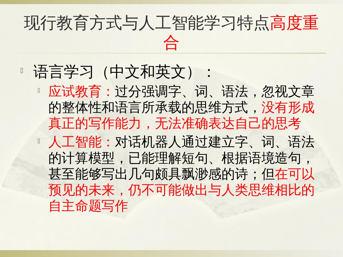 25 . 现行教育方式与人工智能学习特点高度重 合 语言学习(中文和英文): 应试教育:过分强调字、词、语法,忽视文章 的整体性和语言所承载的思维方式,没有形成 真正的写作能力,无法准确表达自己的思考 人工智能:对话机器人通过建立字、词、语法 的计算模型,已能理解短句、根据语境造句, 甚至能够写出几句颇具飘渺感的诗;但在可以 预见的未来,仍不可能做出与人类思维相比的 自主命题写作