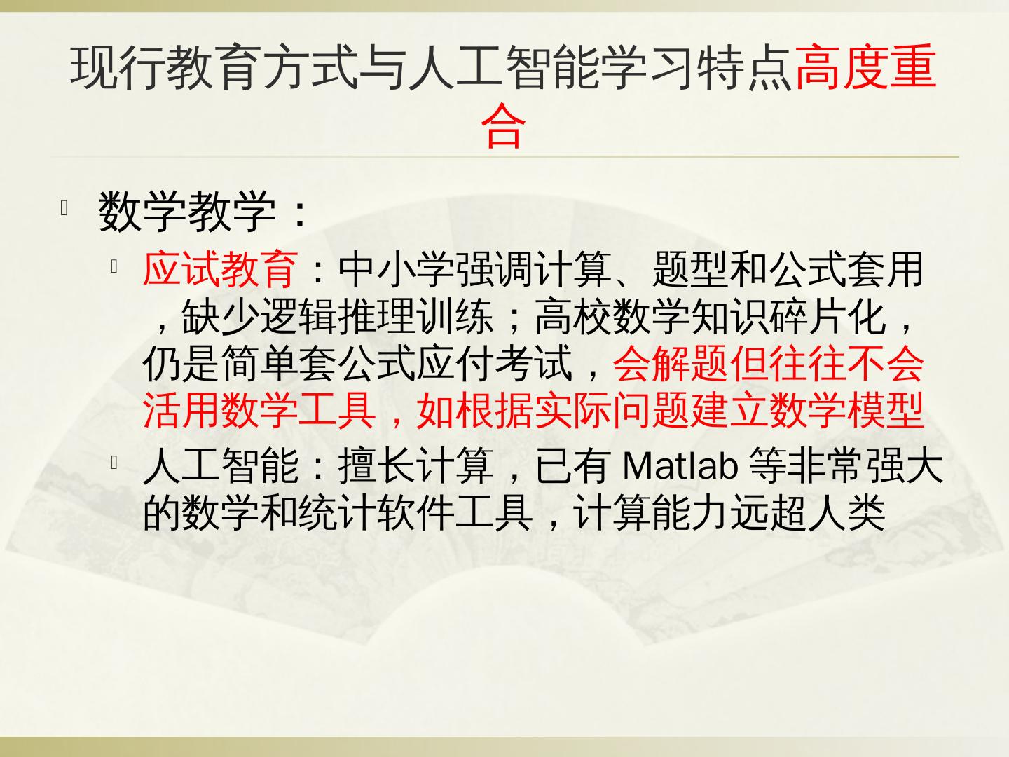 26 . 现行教育方式与人工智能学习特点高度重 合 数学教学: 应试教育:中小学强调计算、题型和公式套用 ,缺少逻辑推理训练;高校数学知识碎片化, 仍是简单套公式应付考试,会解题但往往不会 活用数学工具,如根据实际问题建立数学模型 人工智能:擅长计算,已有 Matlab 等非常强大 的数学和统计软件工具,计算能力远超人类