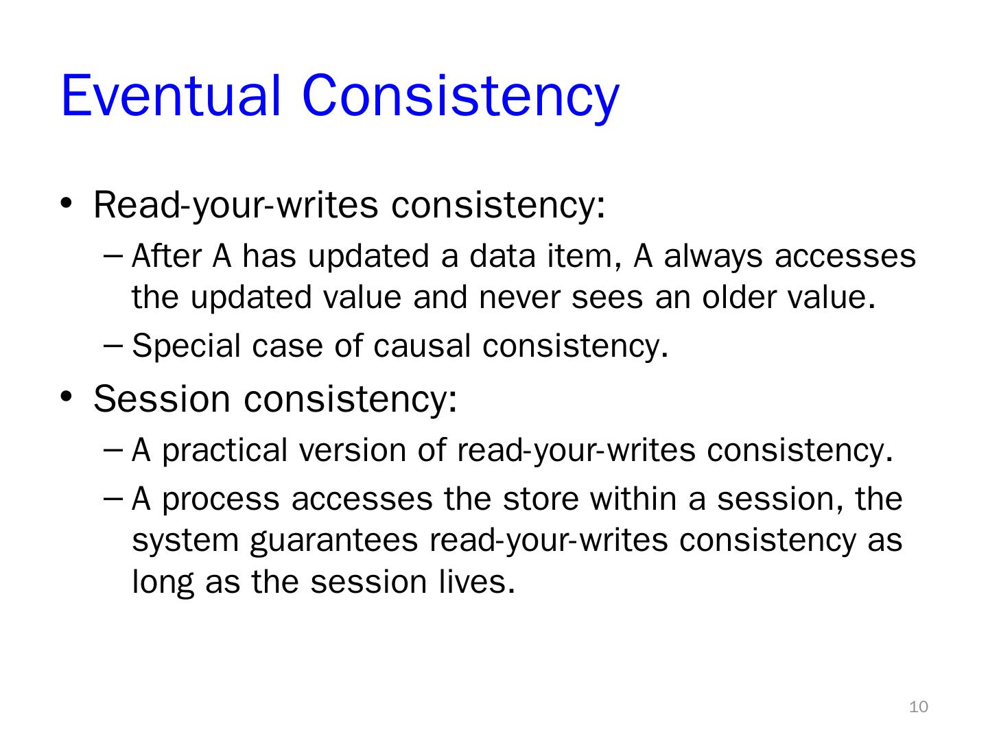 Replication leads to high cost in obtaining consistency (updating all replicas ... Normal eventual consistency rules still apply to access by C that has no causal ...