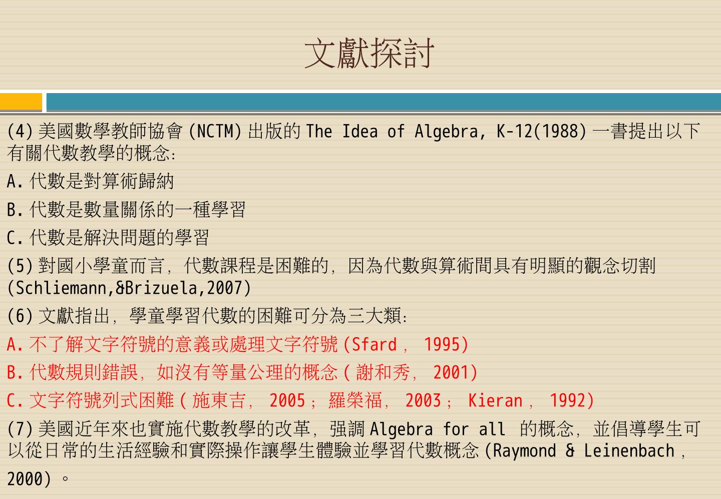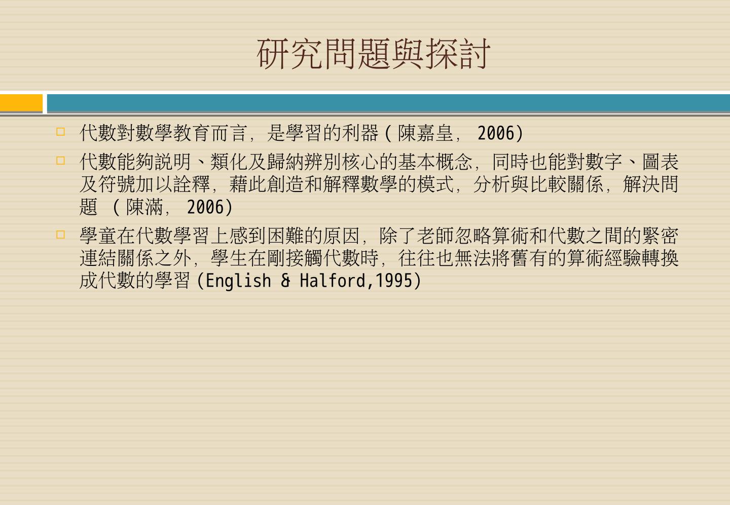 (2)兩組學生對DragonBox持正向看法,老師認同此法有助於學生學習代數概念 ... (1)代數的學習應從學生生活經驗中的數量關係出發探討,培養每位國民觀察數量關係 ...