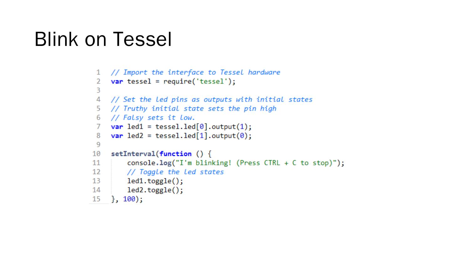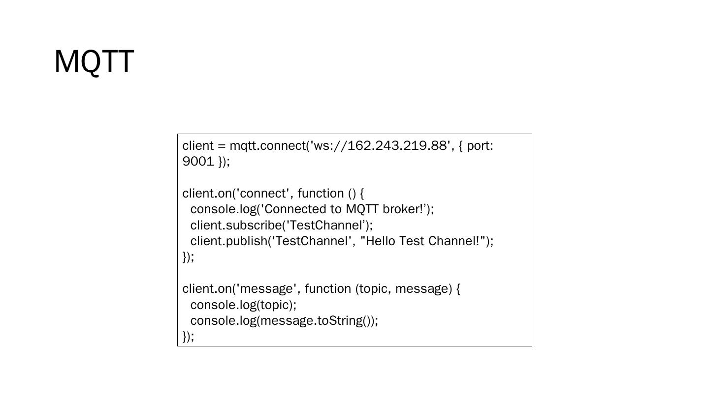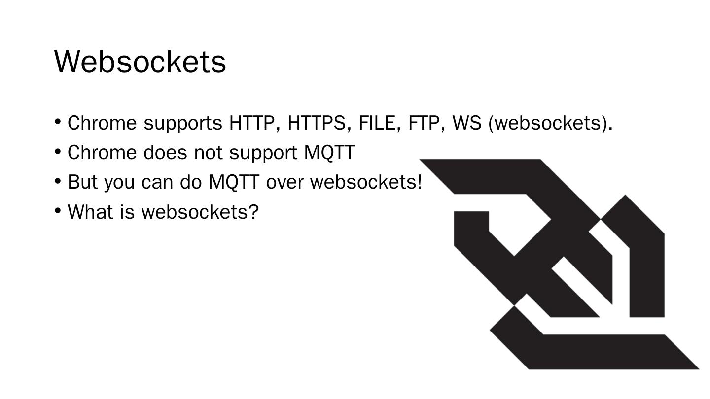 RISC based; Includes WIFI and Ethernet; Javascript based (NodeJS); Pins .... server.js. client.js. MQTT Over Websockets. We can still use MQTT in a browser ...