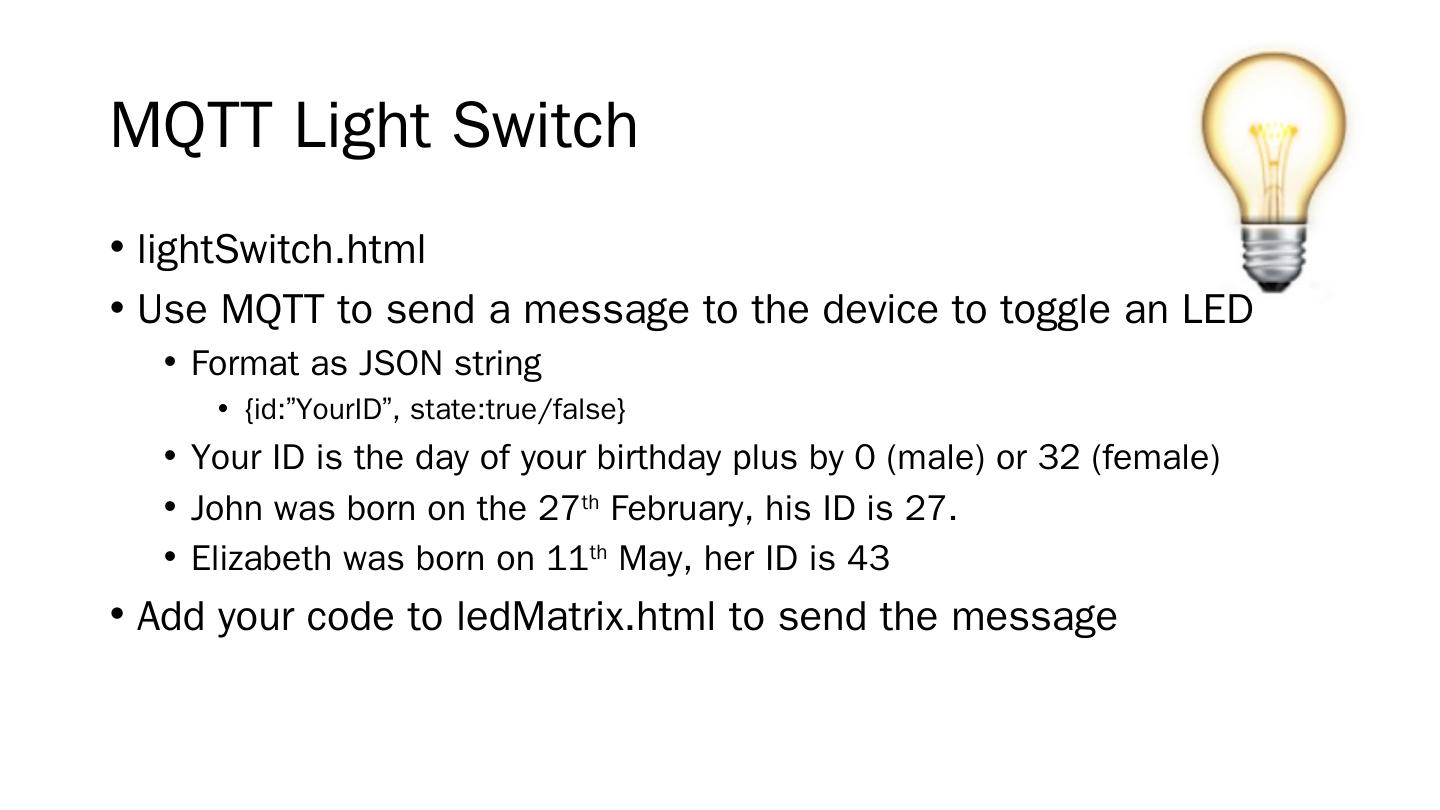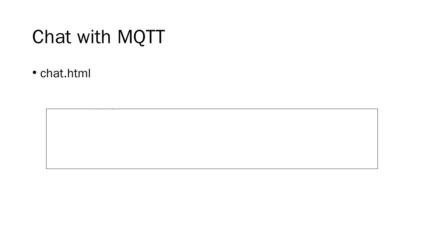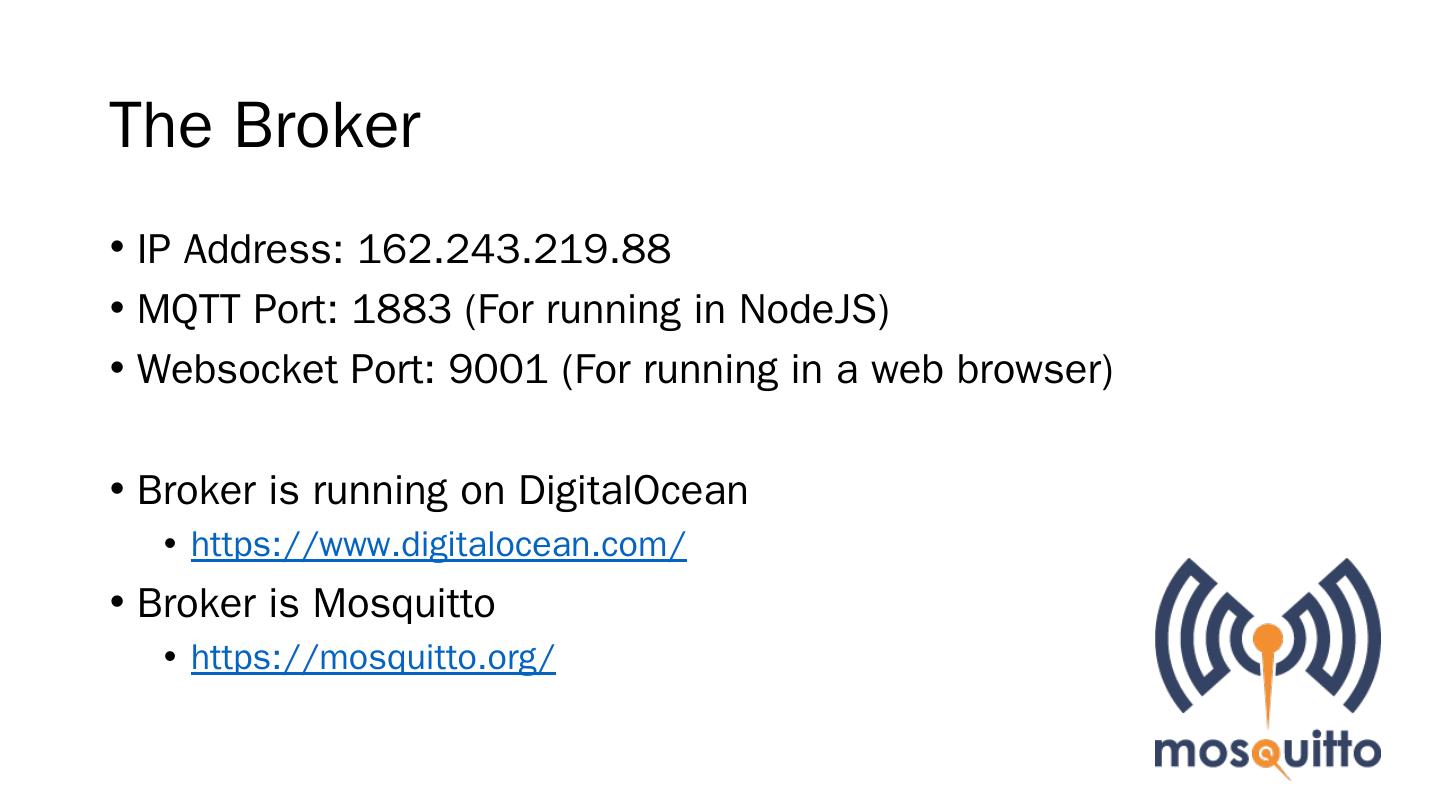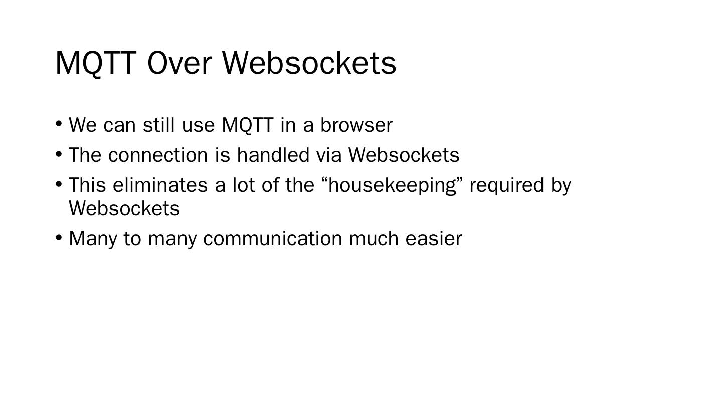 RISC based; Includes WIFI and Ethernet; Javascript based (NodeJS); Pins .... server.js. client.js. MQTT Over Websockets. We can still use MQTT in a browser ...