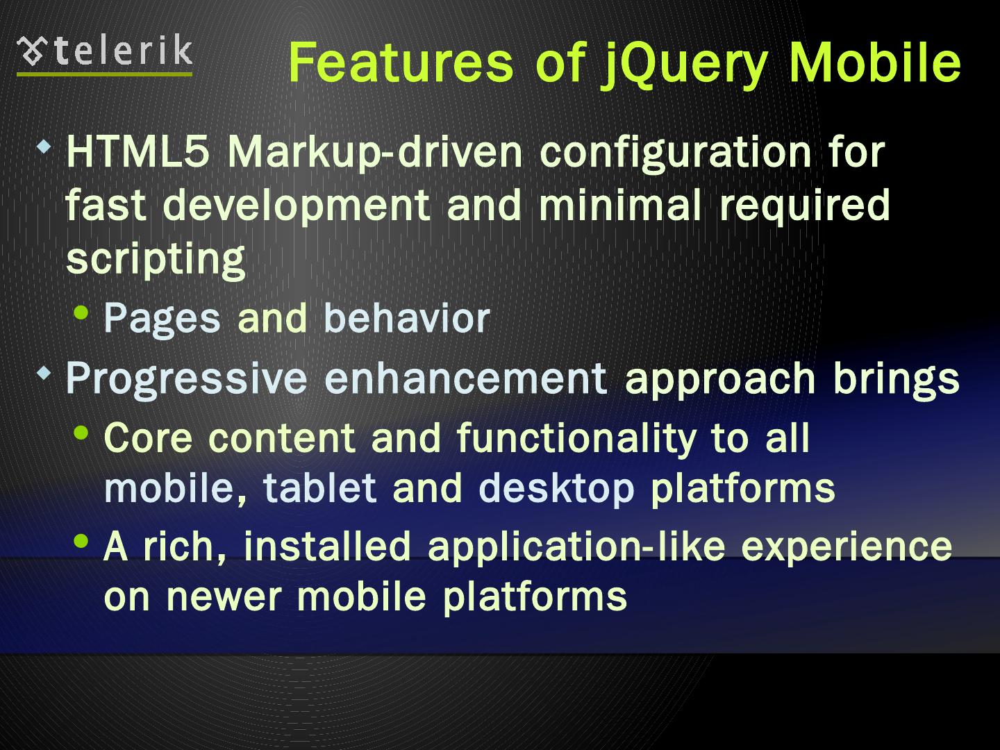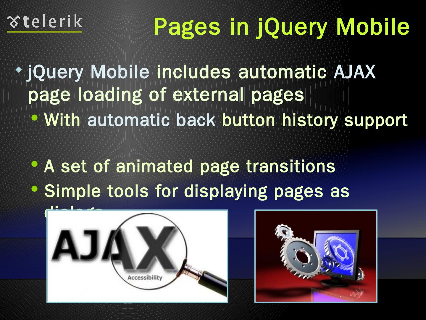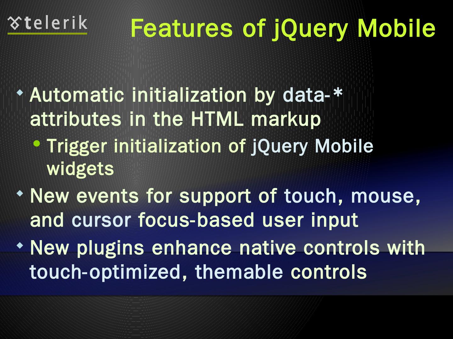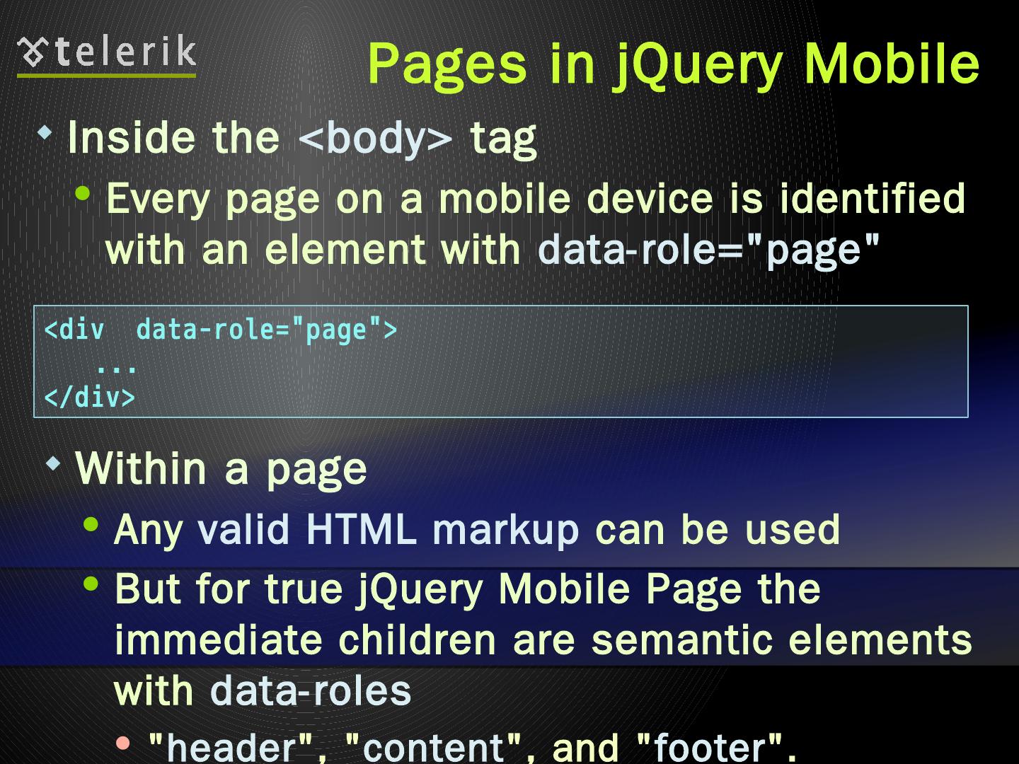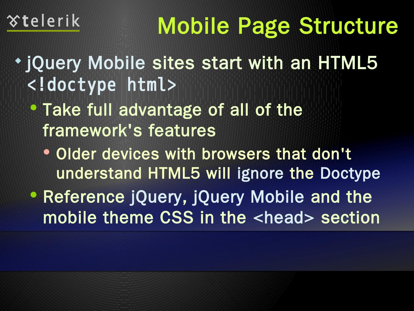 jQuery Mobile Overview; Methods and Utilities; Responsive Layout; Data-* Attributes. Pages; Dialogs; Buttons. jQuery Events; Features of jQuery Mobile. jQuery ...