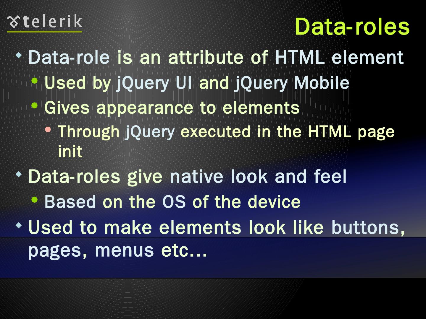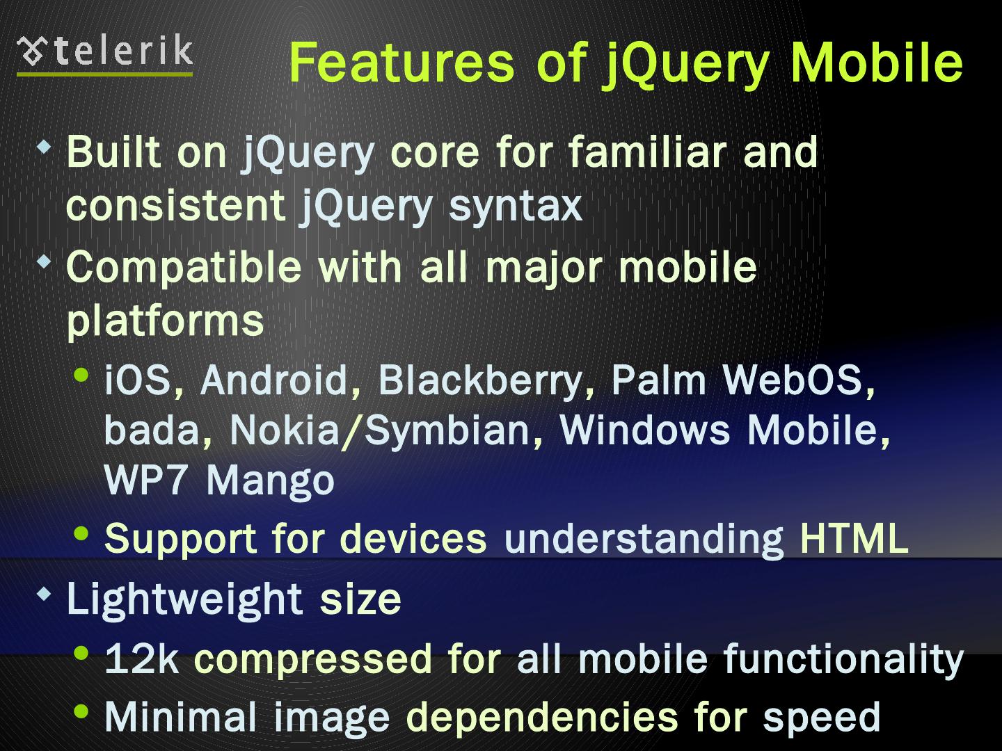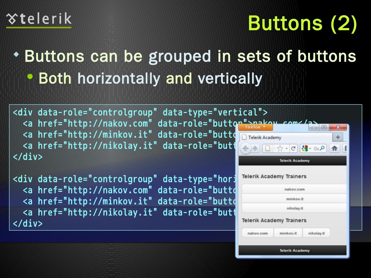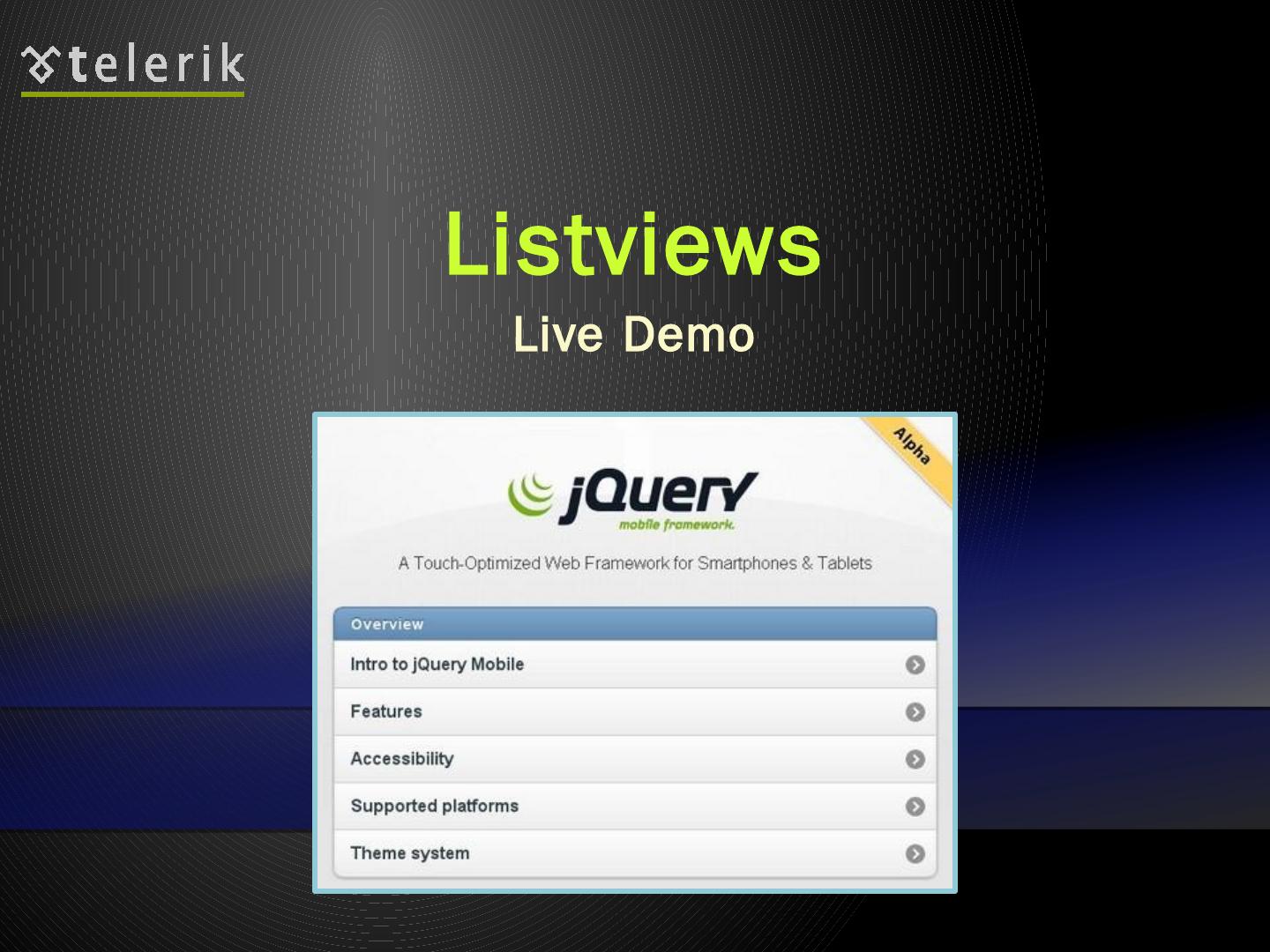 jQuery Mobile Overview; Methods and Utilities; Responsive Layout; Data-* Attributes. Pages; Dialogs; Buttons. jQuery Events; Features of jQuery Mobile. jQuery ...