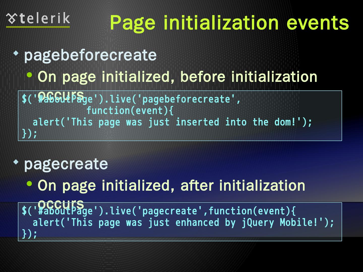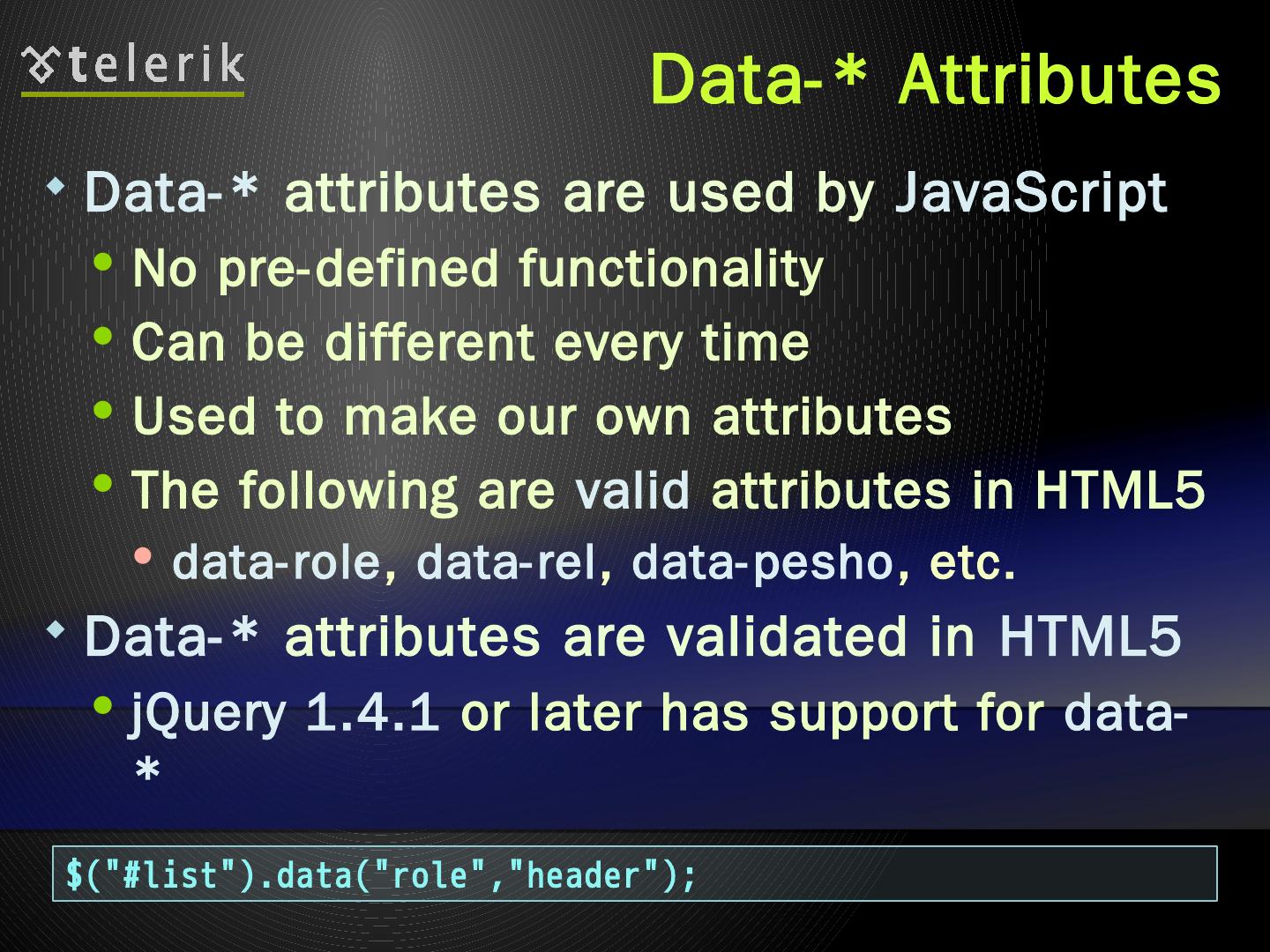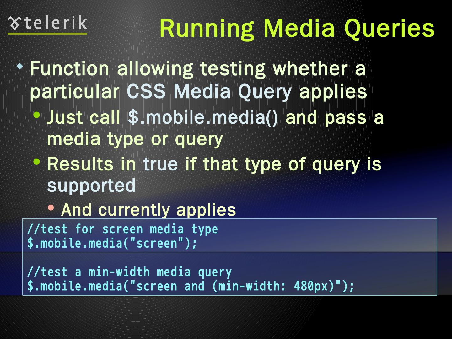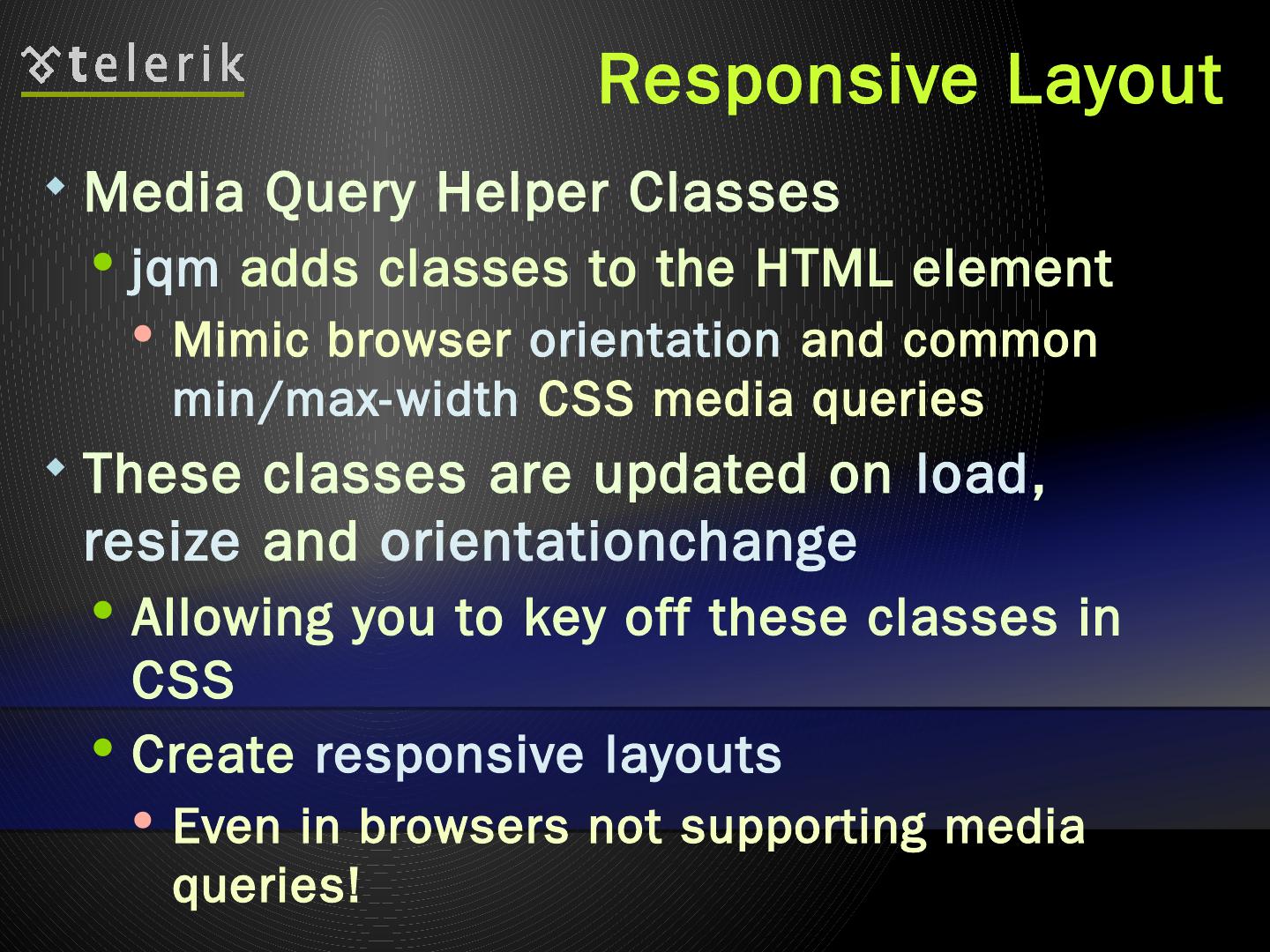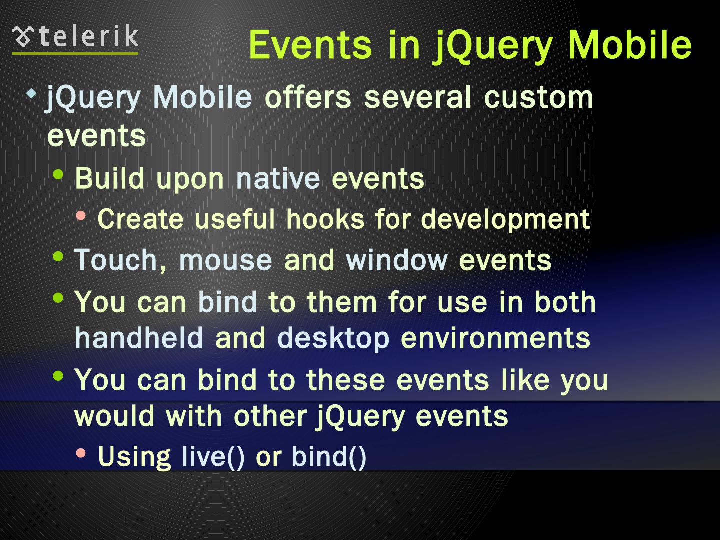jQuery Mobile Overview; Methods and Utilities; Responsive Layout; Data-* Attributes. Pages; Dialogs; Buttons. jQuery Events; Features of jQuery Mobile. jQuery ...