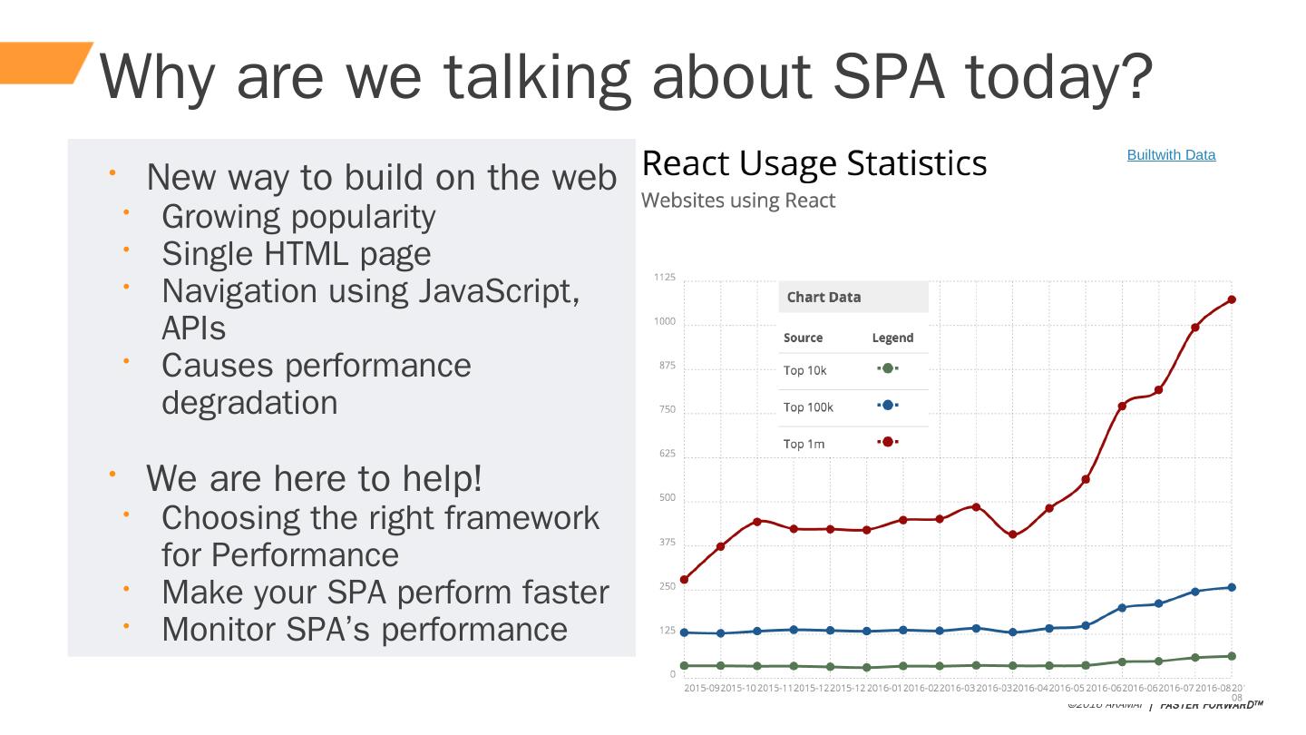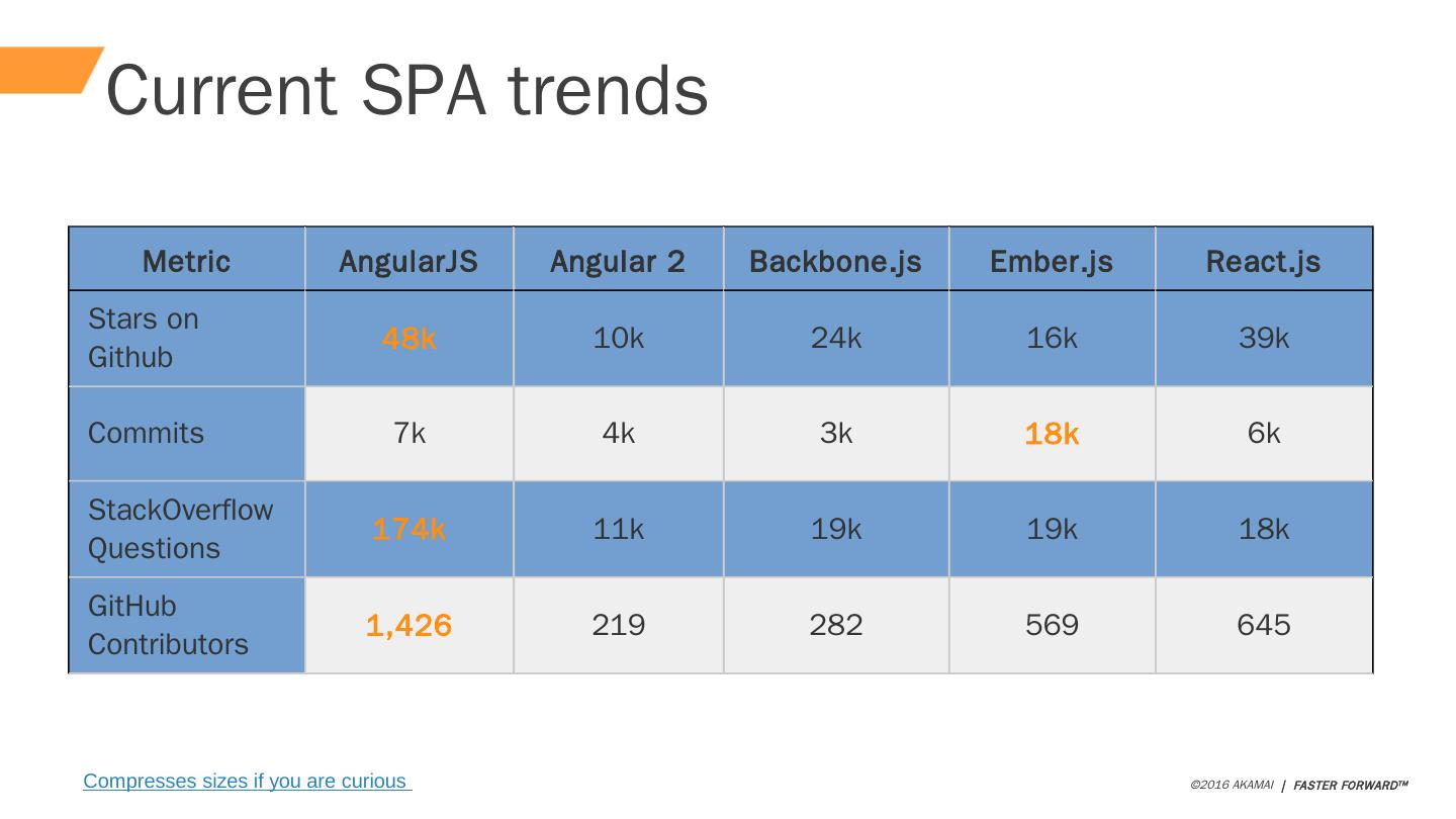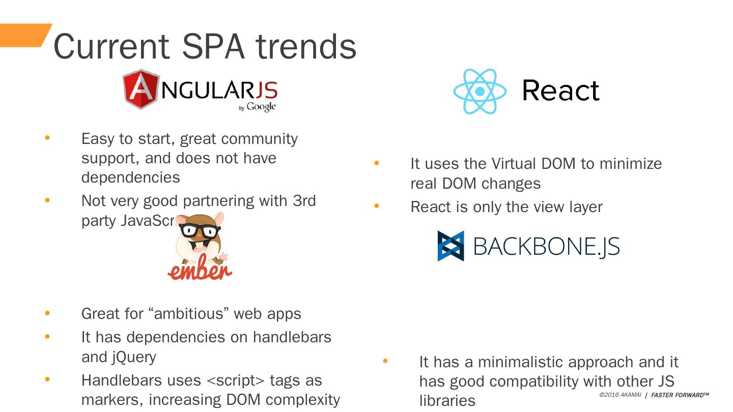 Growing popularity; Single HTML page; Navigation using JavaScript, APIs; Causes performance ... Metric, AngularJS, Angular 2, Backbone.js, Ember.js, React.js.