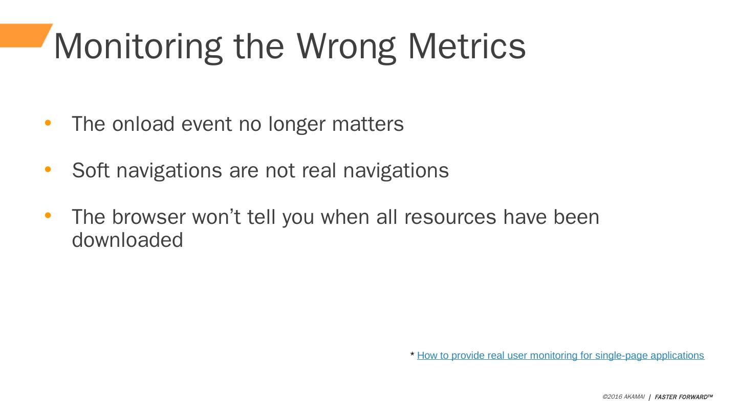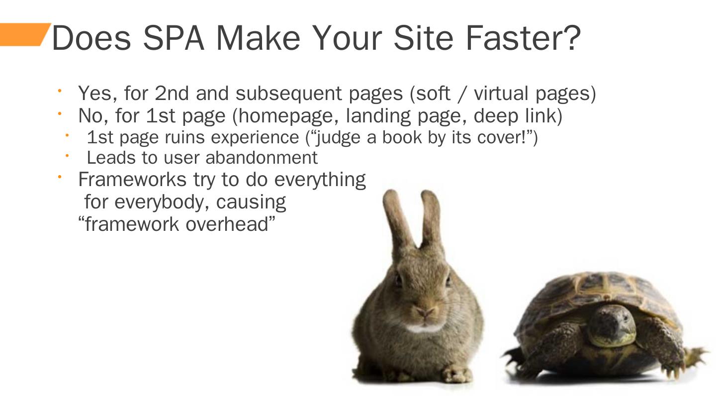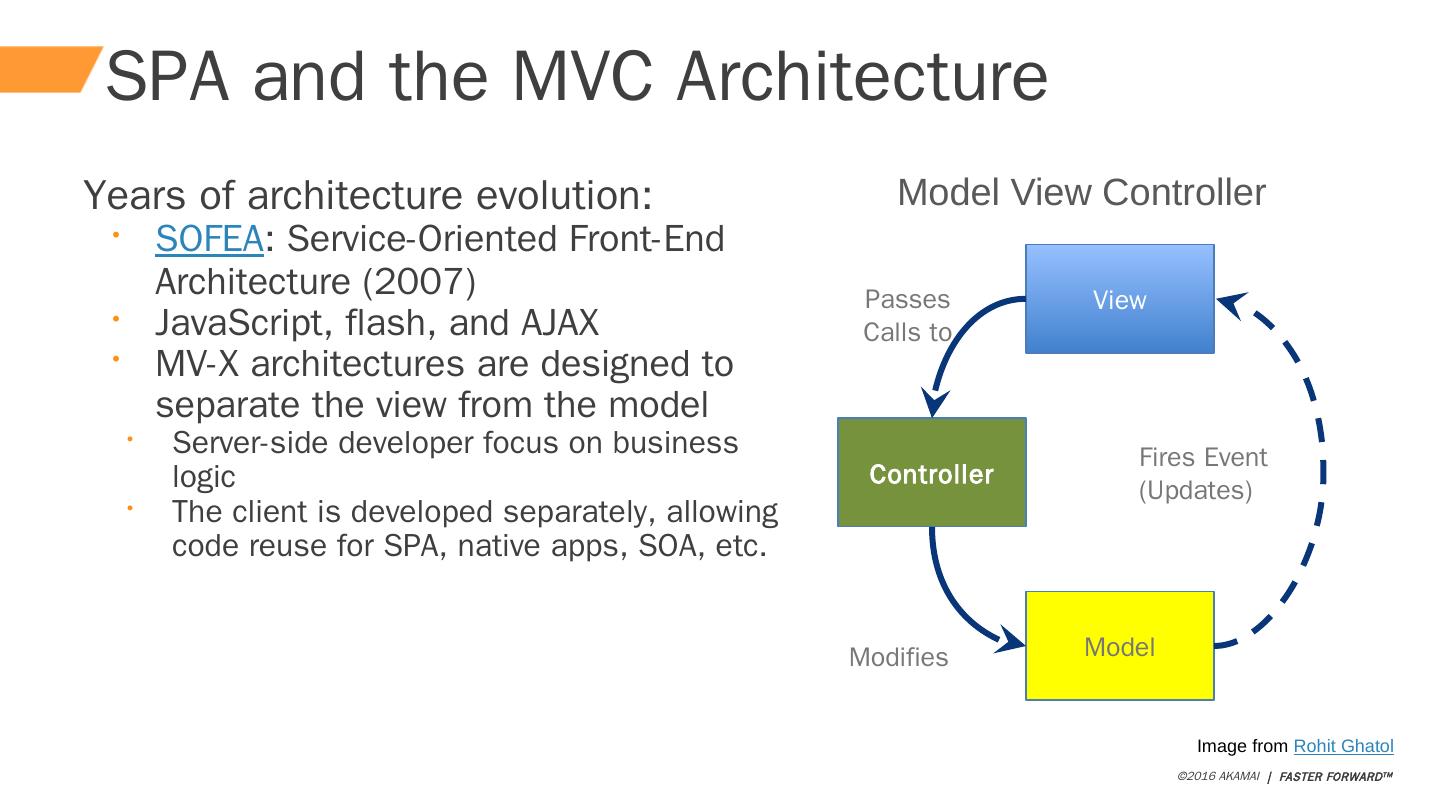 Growing popularity; Single HTML page; Navigation using JavaScript, APIs; Causes performance ... Metric, AngularJS, Angular 2, Backbone.js, Ember.js, React.js.