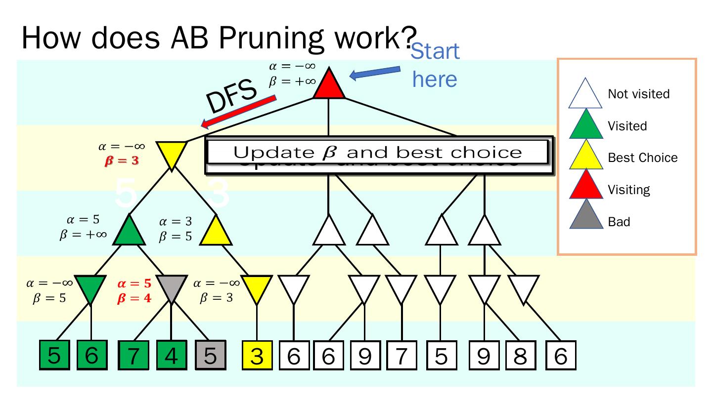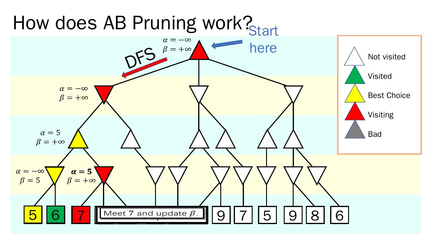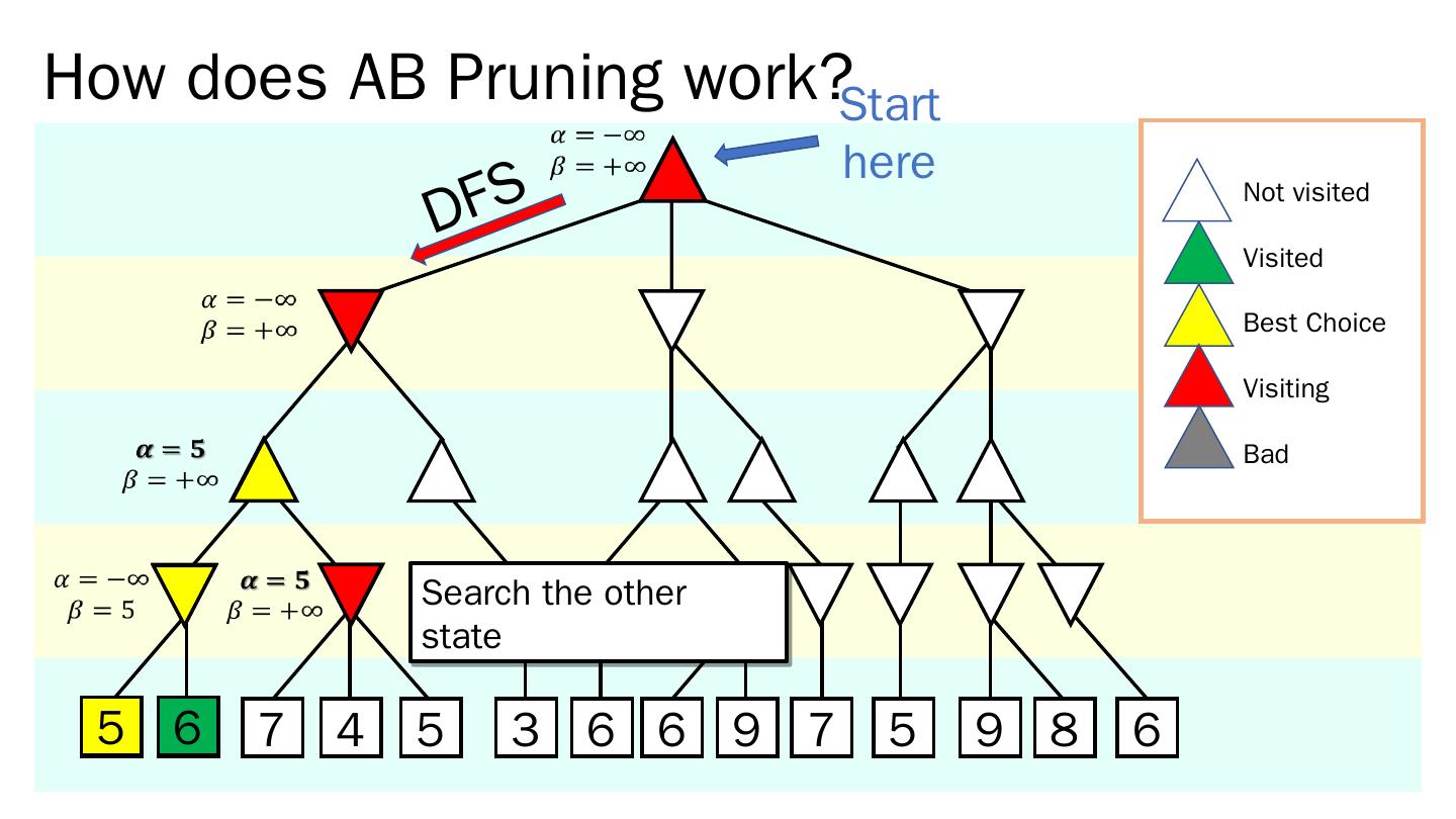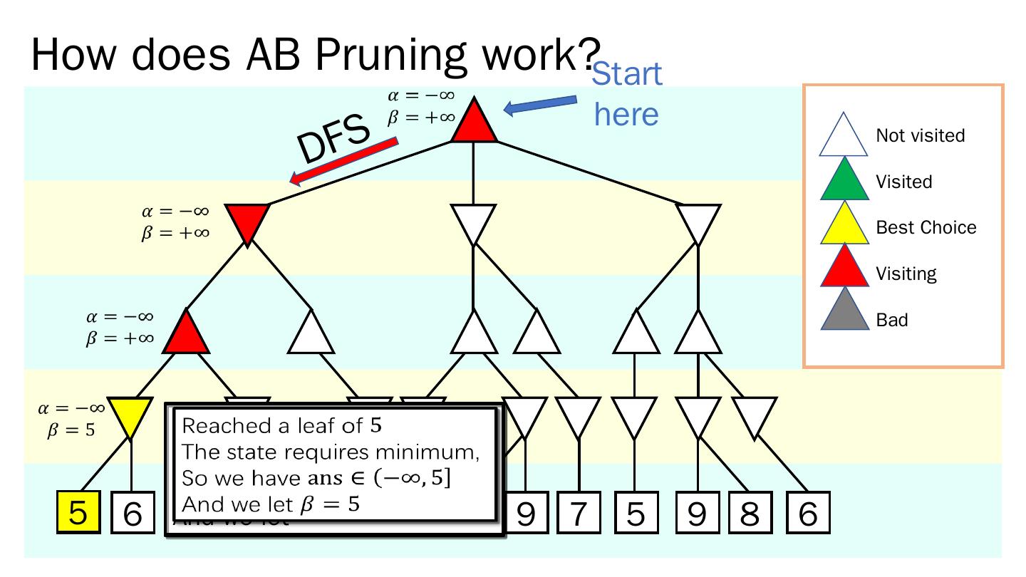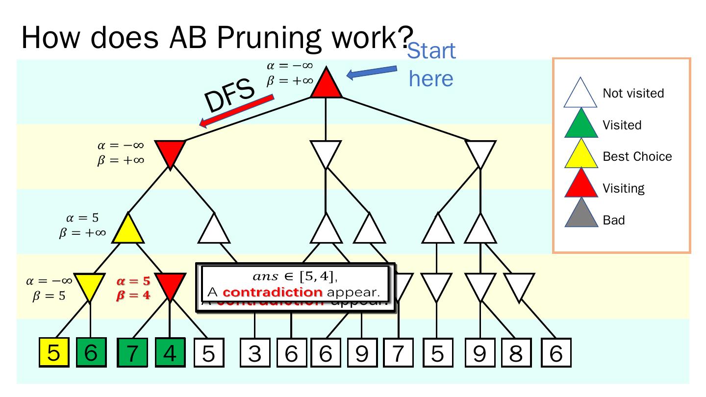 DFS搜索这棵决策树,在深度为4的第一个节点有两种决策,对我的优势分别是10和+∞。对方会选择让我优势最小化的决策(10);第二个节点只有一种决策,优势为5。
