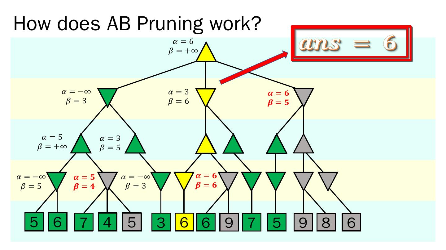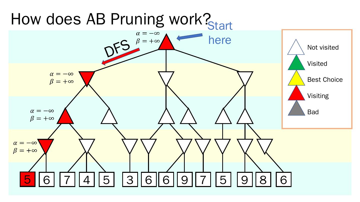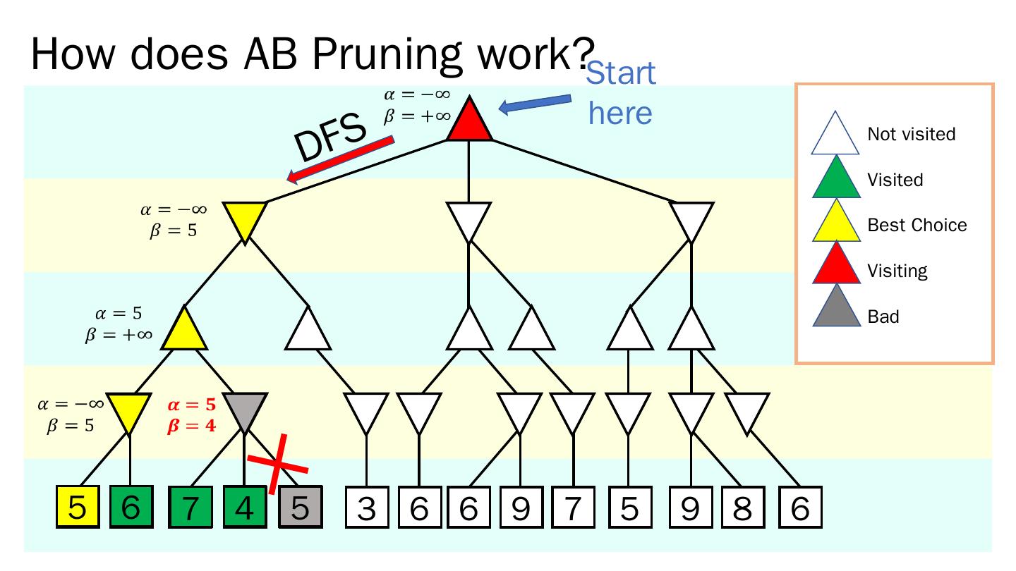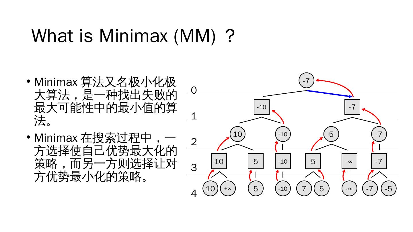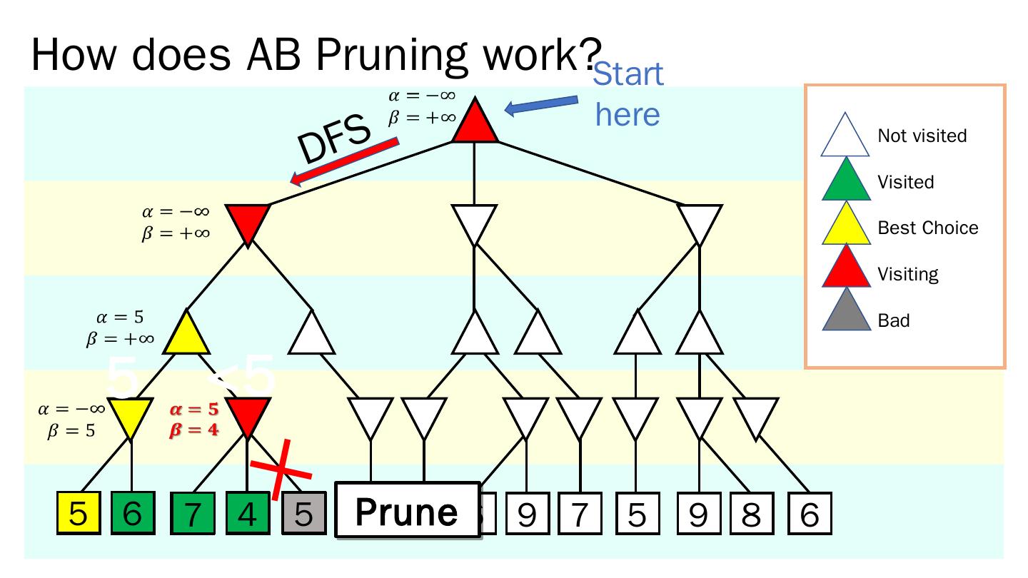 DFS搜索这棵决策树,在深度为4的第一个节点有两种决策,对我的优势分别是10和+∞。对方会选择让我优势最小化的决策(10);第二个节点只有一种决策,优势为5。