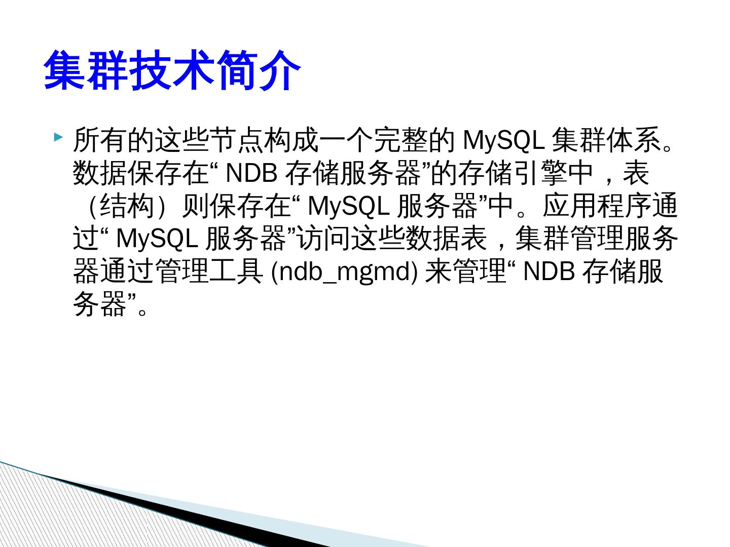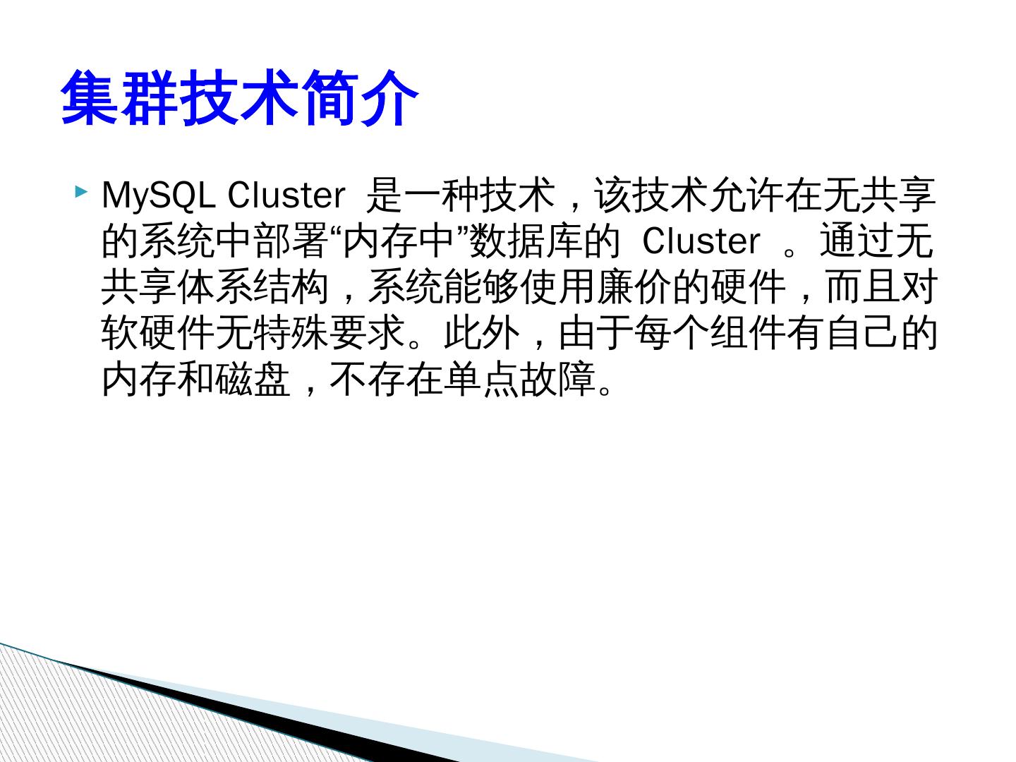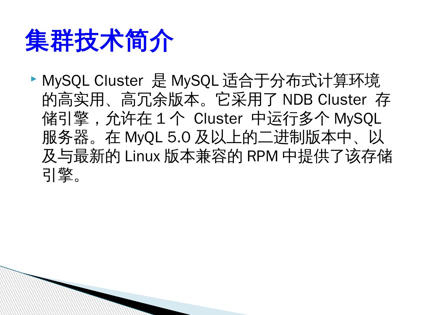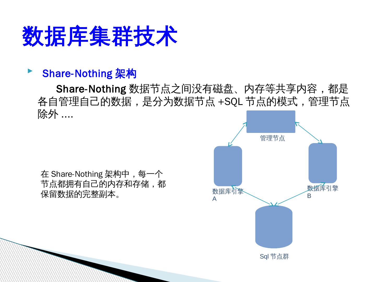 Share-Nothing数据节点之间没有磁盘、内存等共享内容,都是各自管理自己的 ... 在MyQL 5.0及以上的二进制版本中、以及与最新的Linux版本兼容的RPM中提供了该 ...