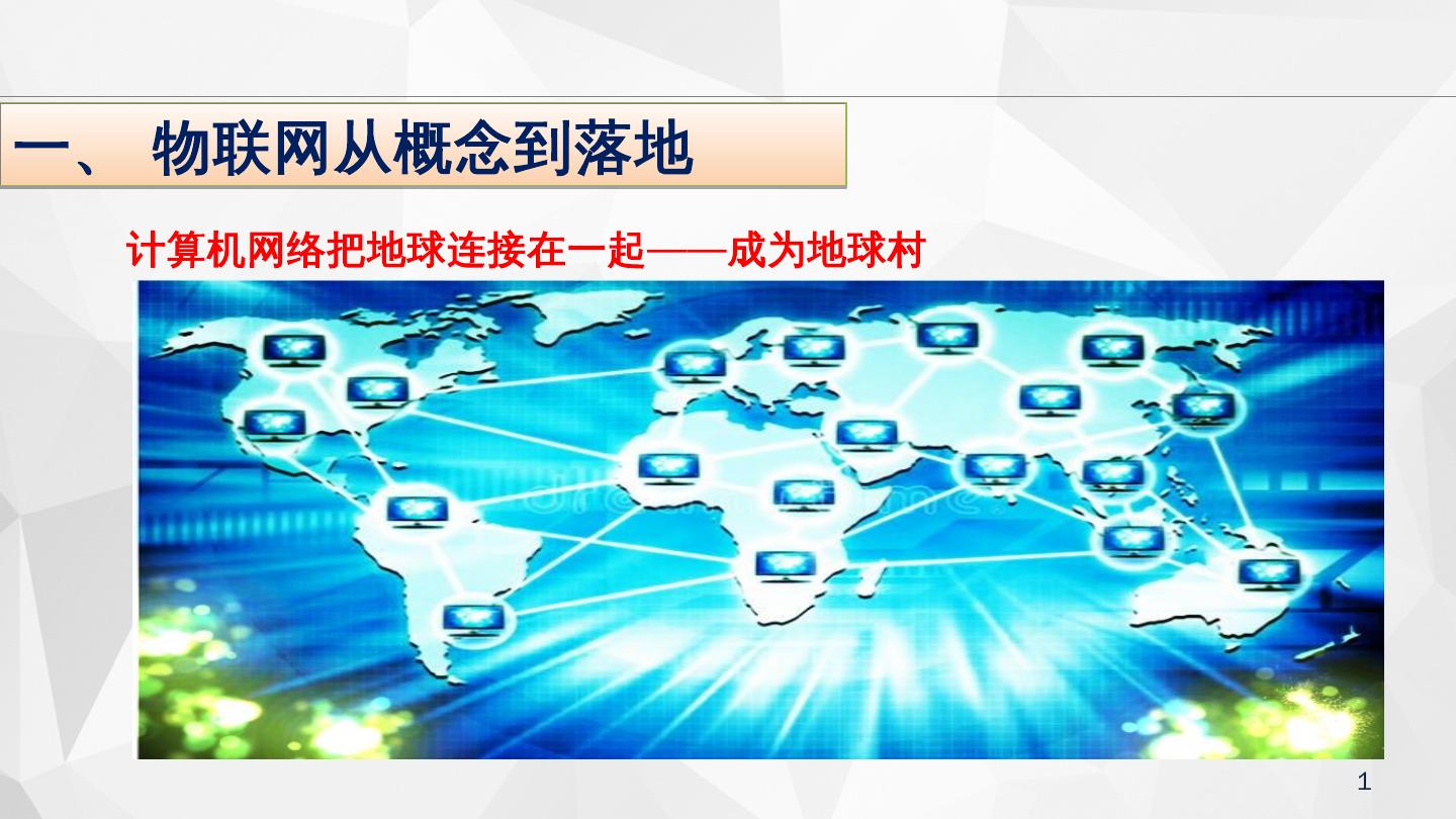 计算机网络把地球连接在一起——成为地球村. 2. 把万物与计算机网络连接在一起— —物联网. 一、 物联网从概念到落地. 3. 物联网概念的热络起点(我国)——2009年.