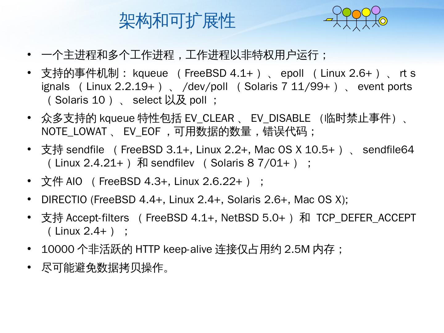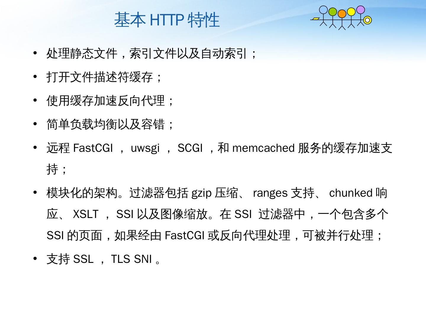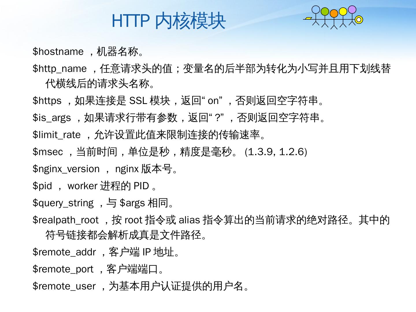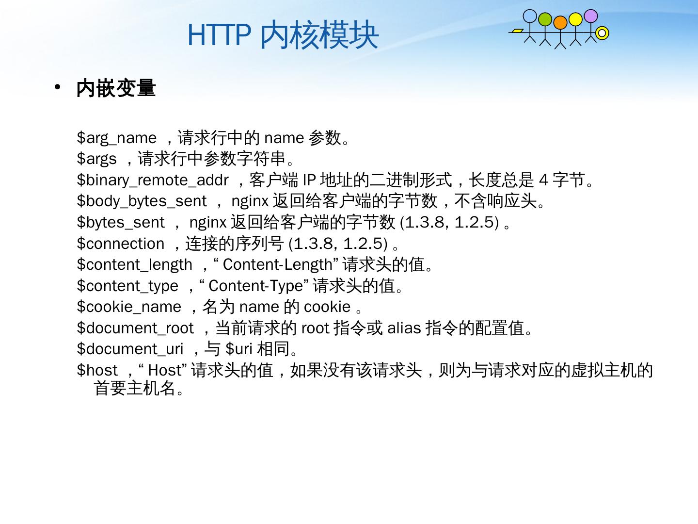 Nginx详解. ——介绍、模块、运维. 薛长俊. 2013.8. 目 录. 介绍. 模块. 运维. 目 录. 介绍. 模块. 运维. 基本HTTP特性. 处理静态文件,索引文件以及自动索引;; 打开文件 ...