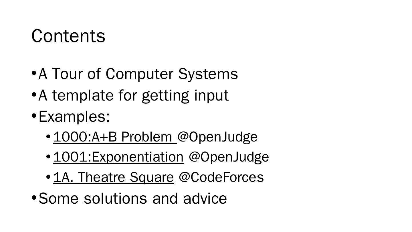 Python practice. Hongfei Yan. 2017/10/18. Contents. A Tour of Computer Systems; A template for getting input; Examples: 1000:A+B Problem @ OpenJudge ...