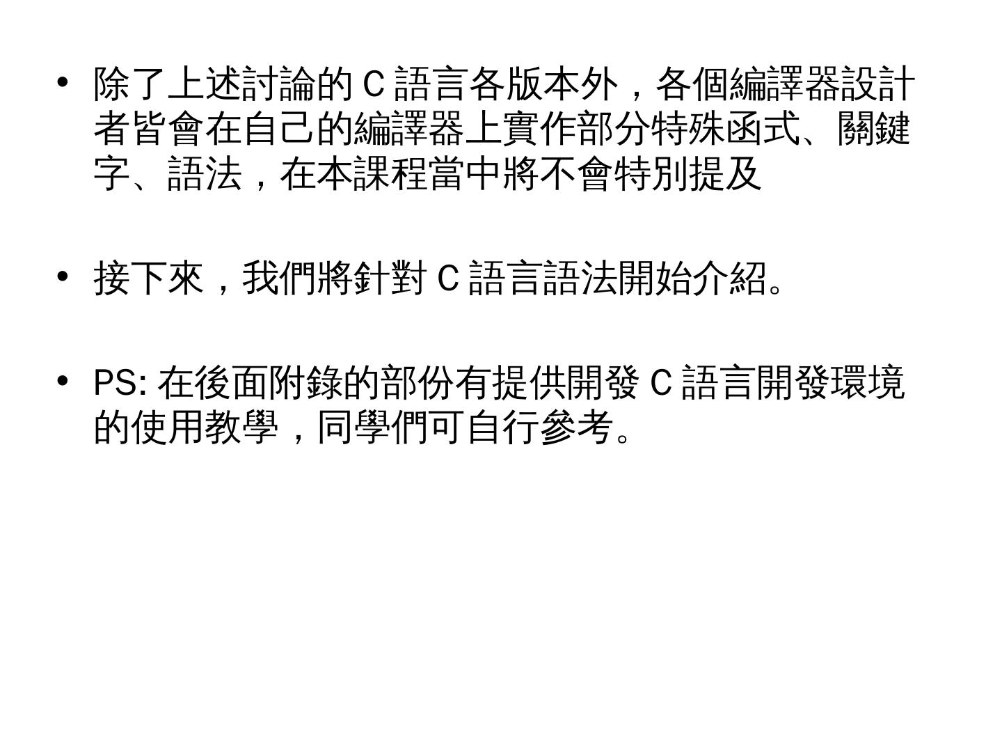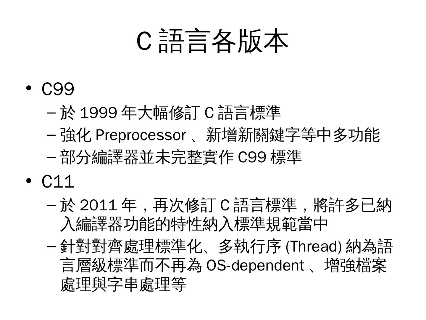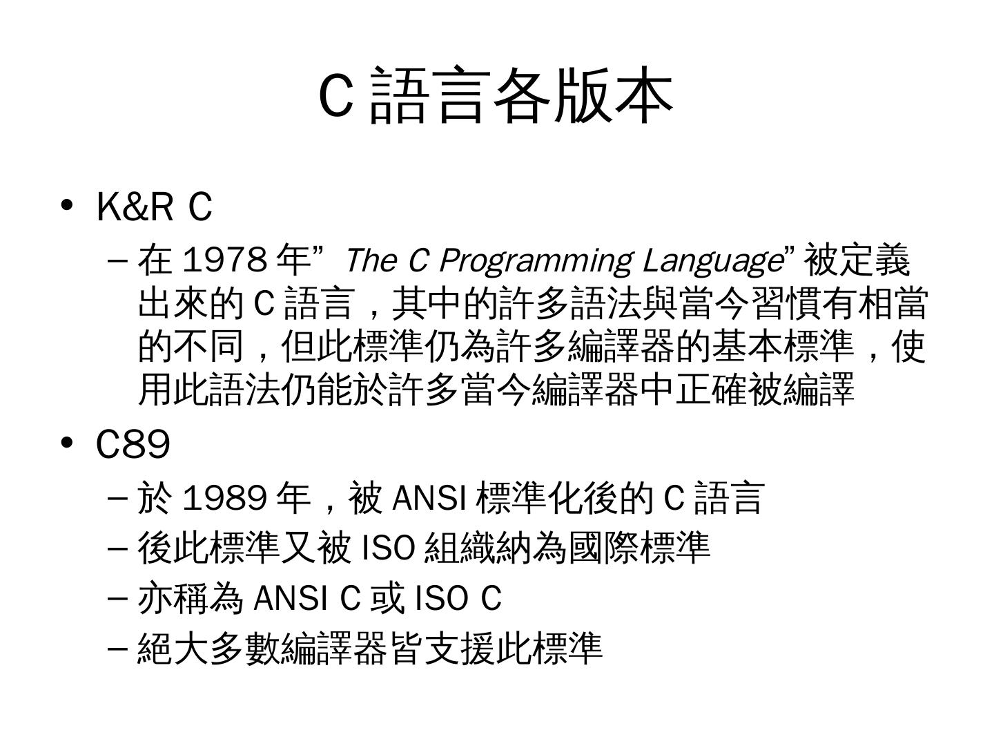 在1978年” The C Programming Language”被定義出來的C語言,其中的許多語法與當今習慣有相當的不同,但此標準仍為許多編譯器的基本標準,使用此語法仍能於 ...