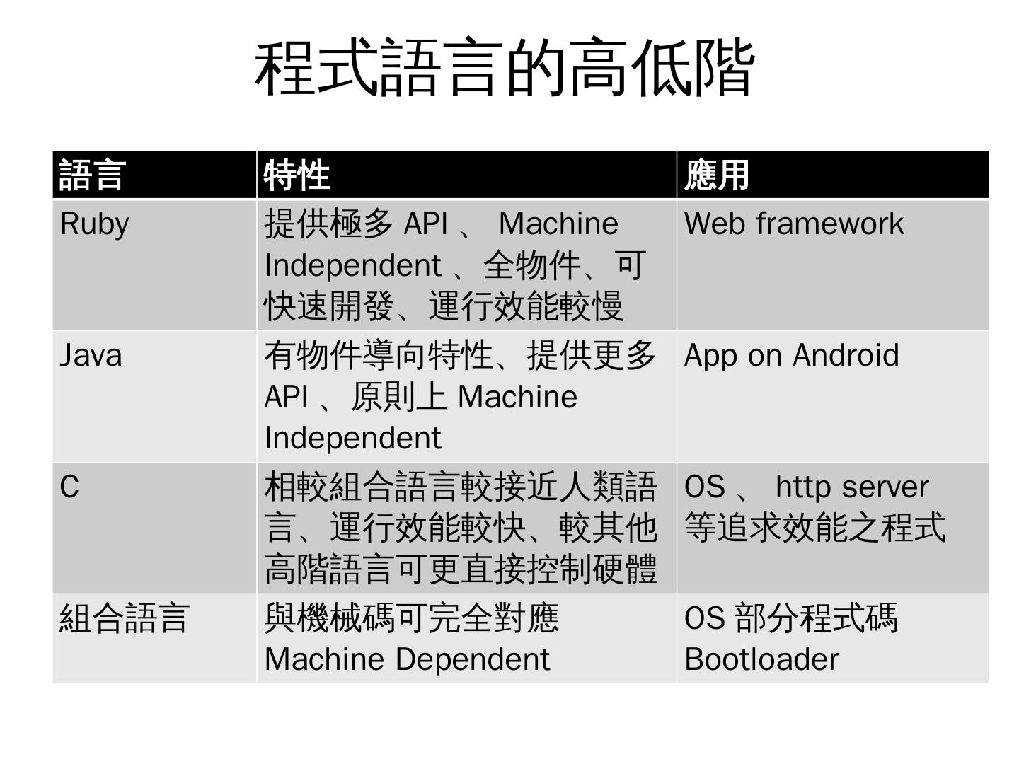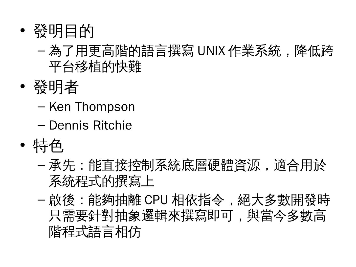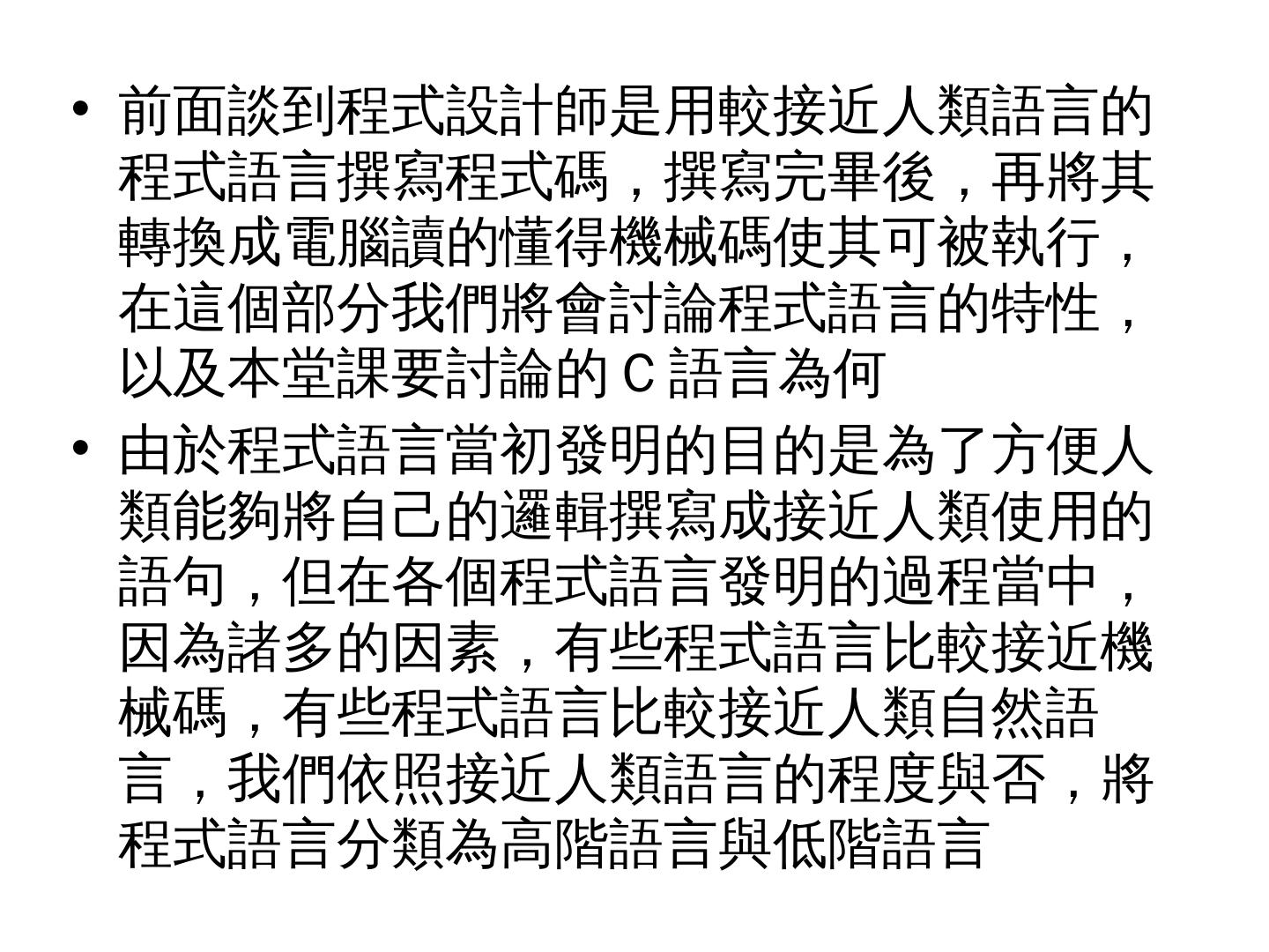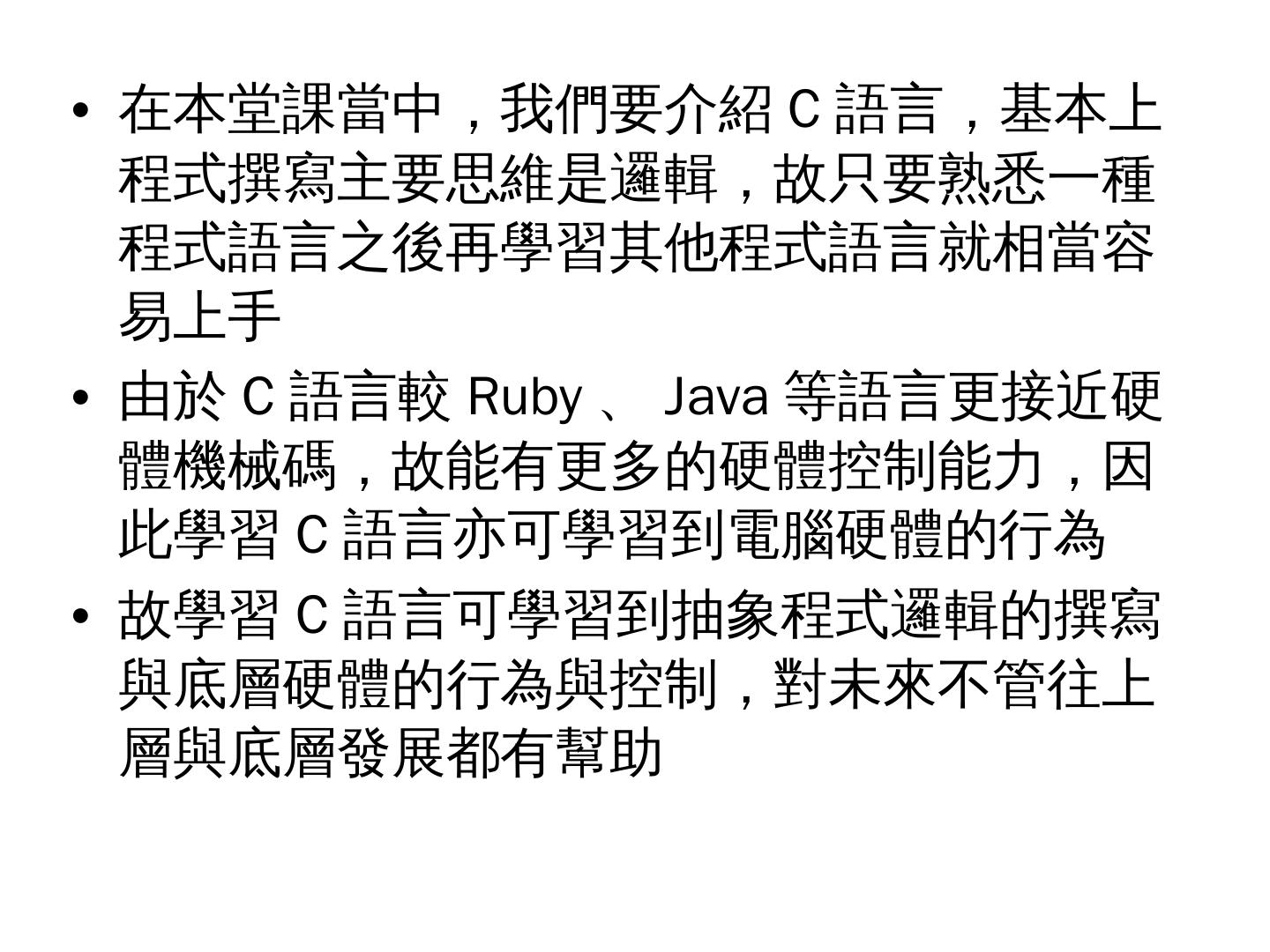 在1978年” The C Programming Language”被定義出來的C語言,其中的許多語法與當今習慣有相當的不同,但此標準仍為許多編譯器的基本標準,使用此語法仍能於 ...