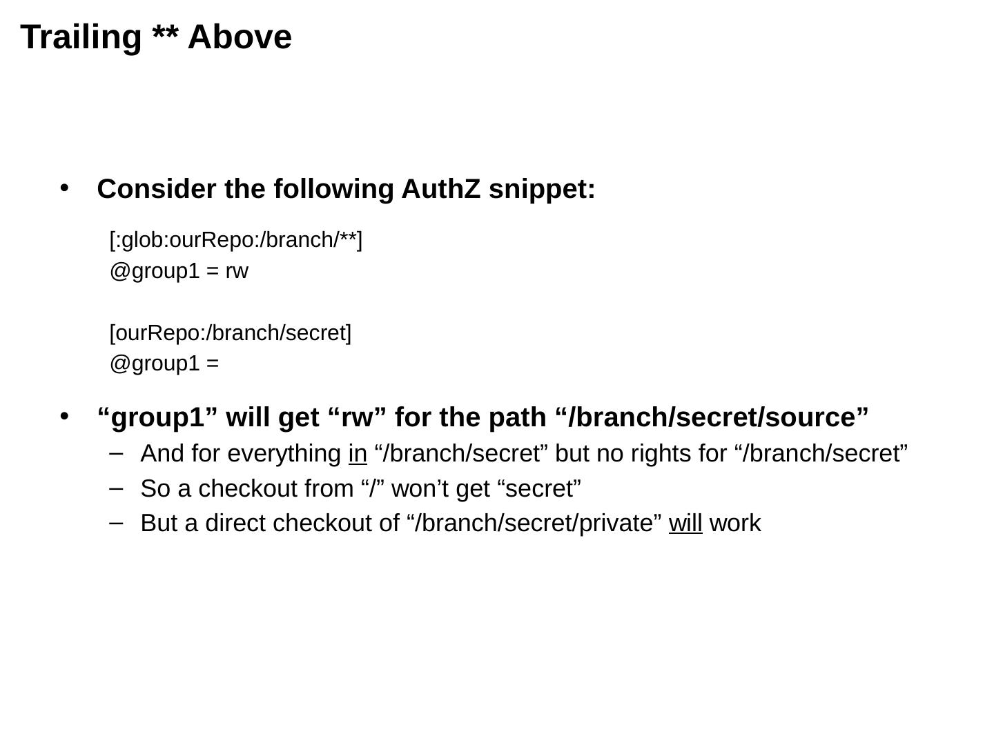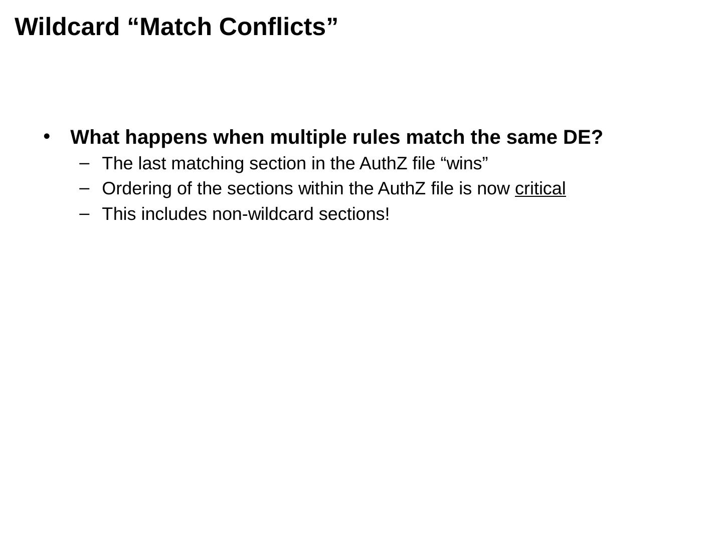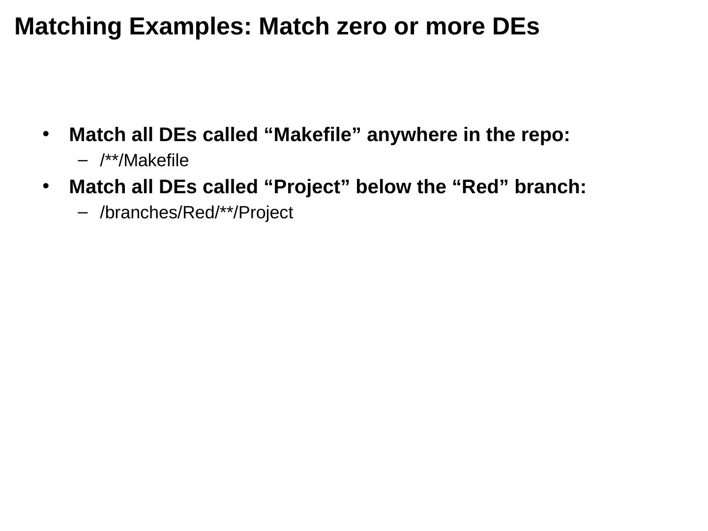 See: https://wiki.apache.org/subversion/AuthzImprovements. Subversion Wildcard Atoms. A “directory entry” is anything you can put in a directory. A file, directory ...