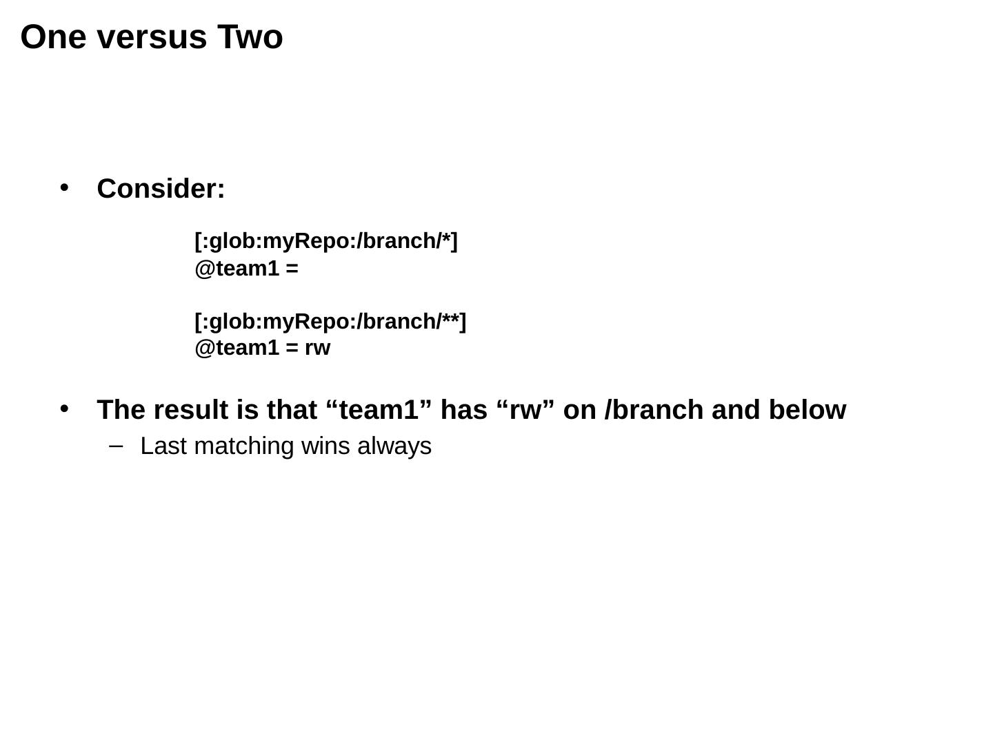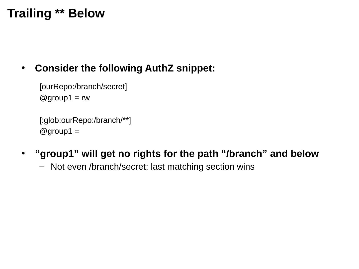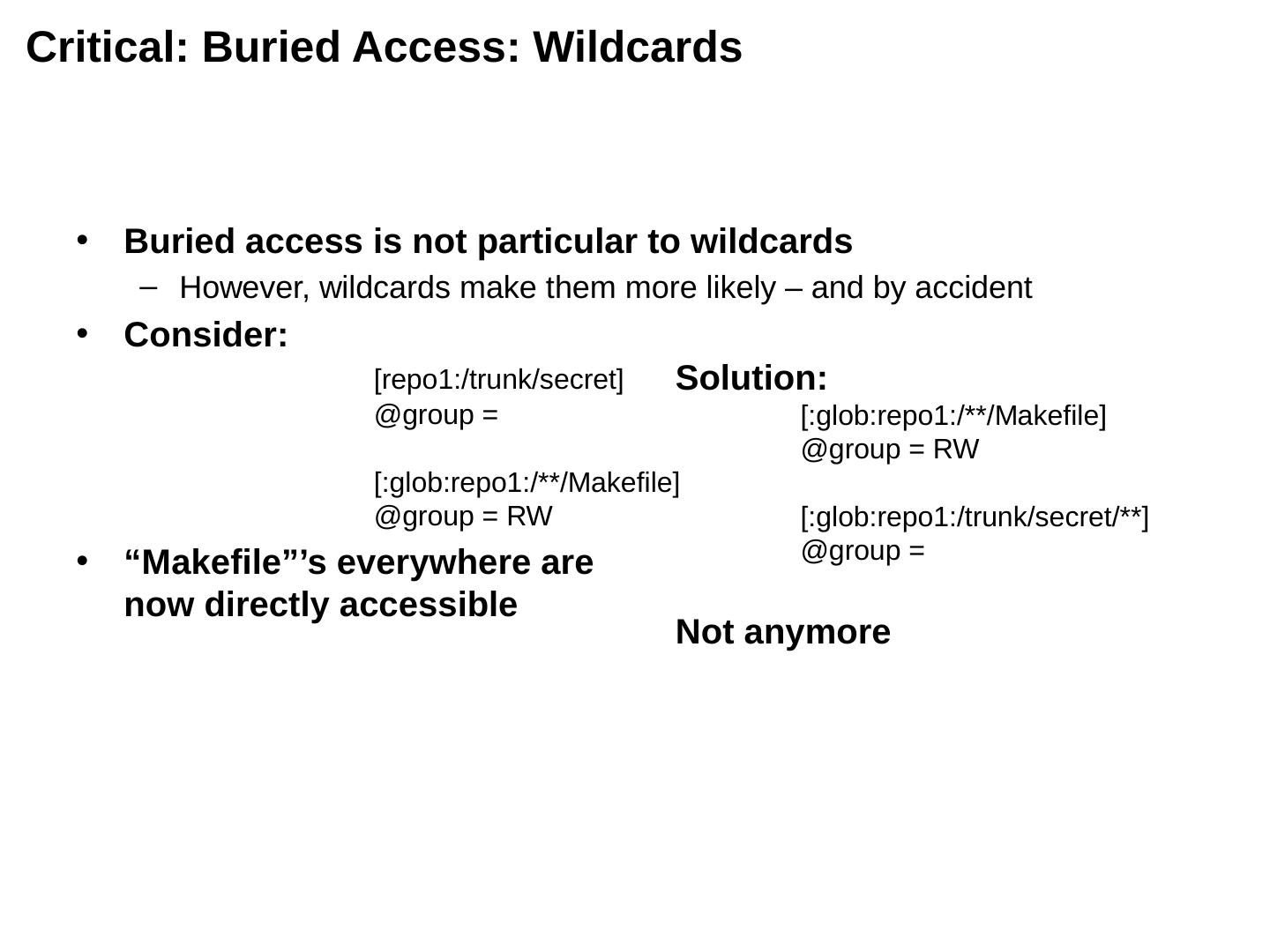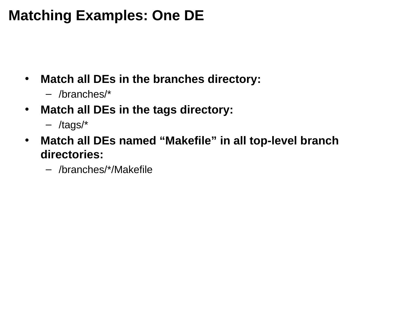 See: https://wiki.apache.org/subversion/AuthzImprovements. Subversion Wildcard Atoms. A “directory entry” is anything you can put in a directory. A file, directory ...