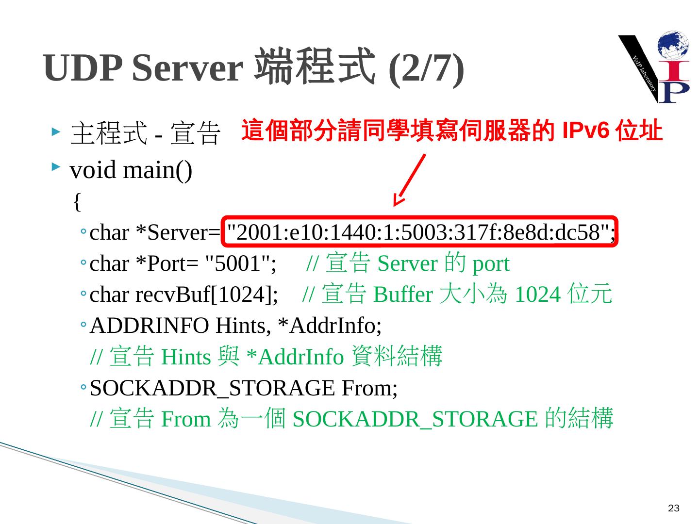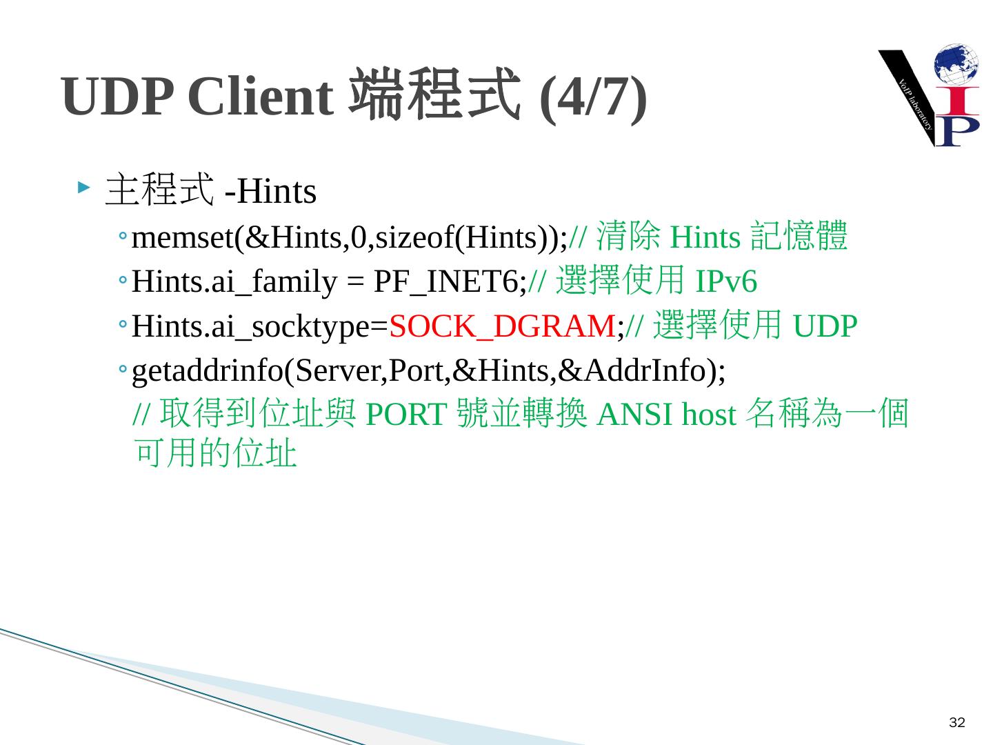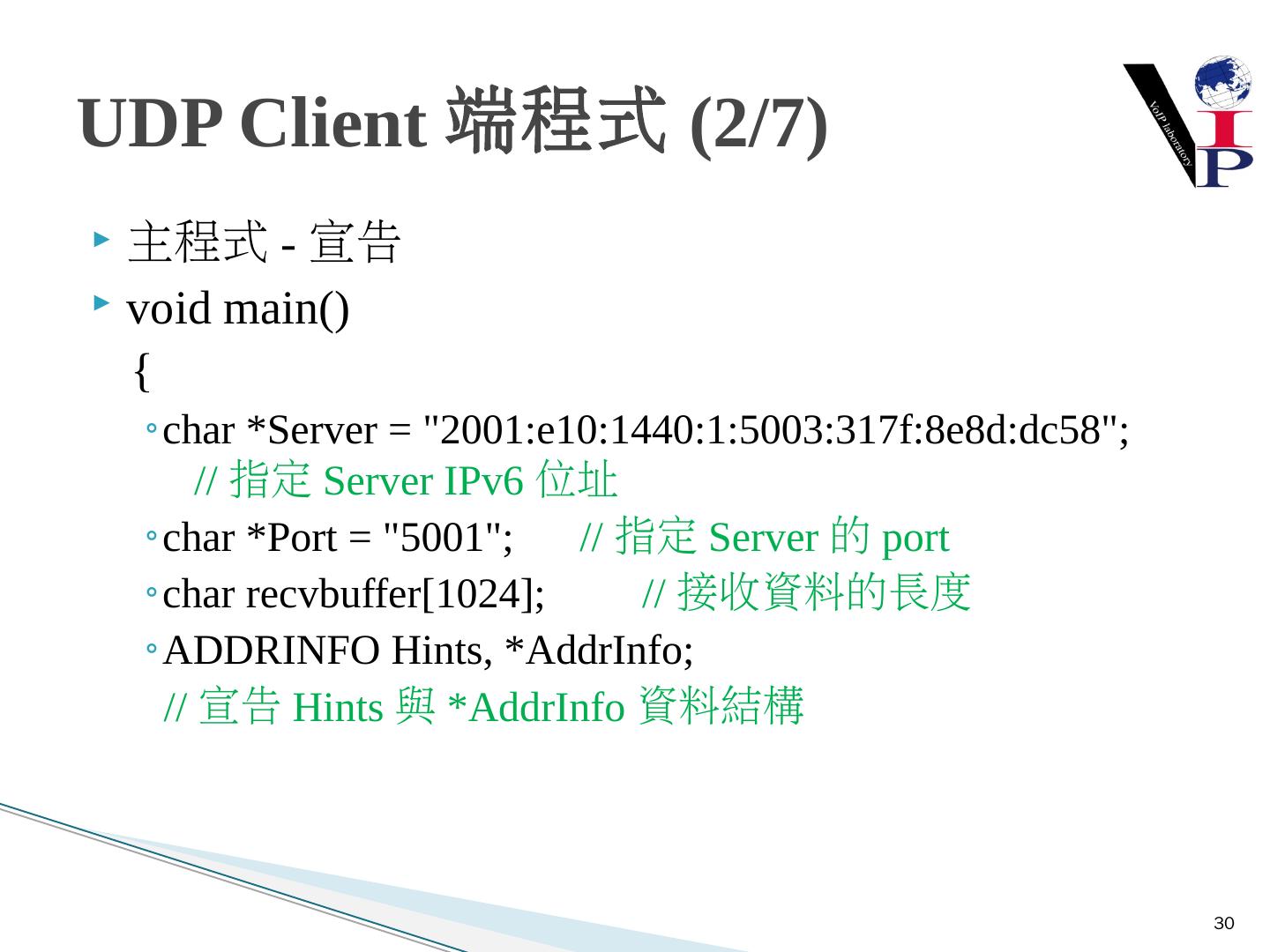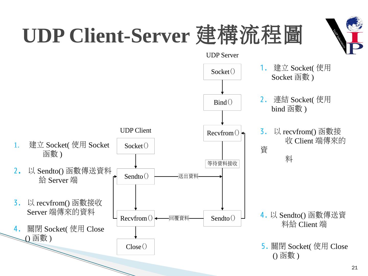 教同學們使用Microsoft Visual Studio 2008以及C語言寫出IPv6 TCP的Server端與Client 端 ... 建立Server端Socket使用IPv6與TCP .... UDP Client-Server建構流程圖.