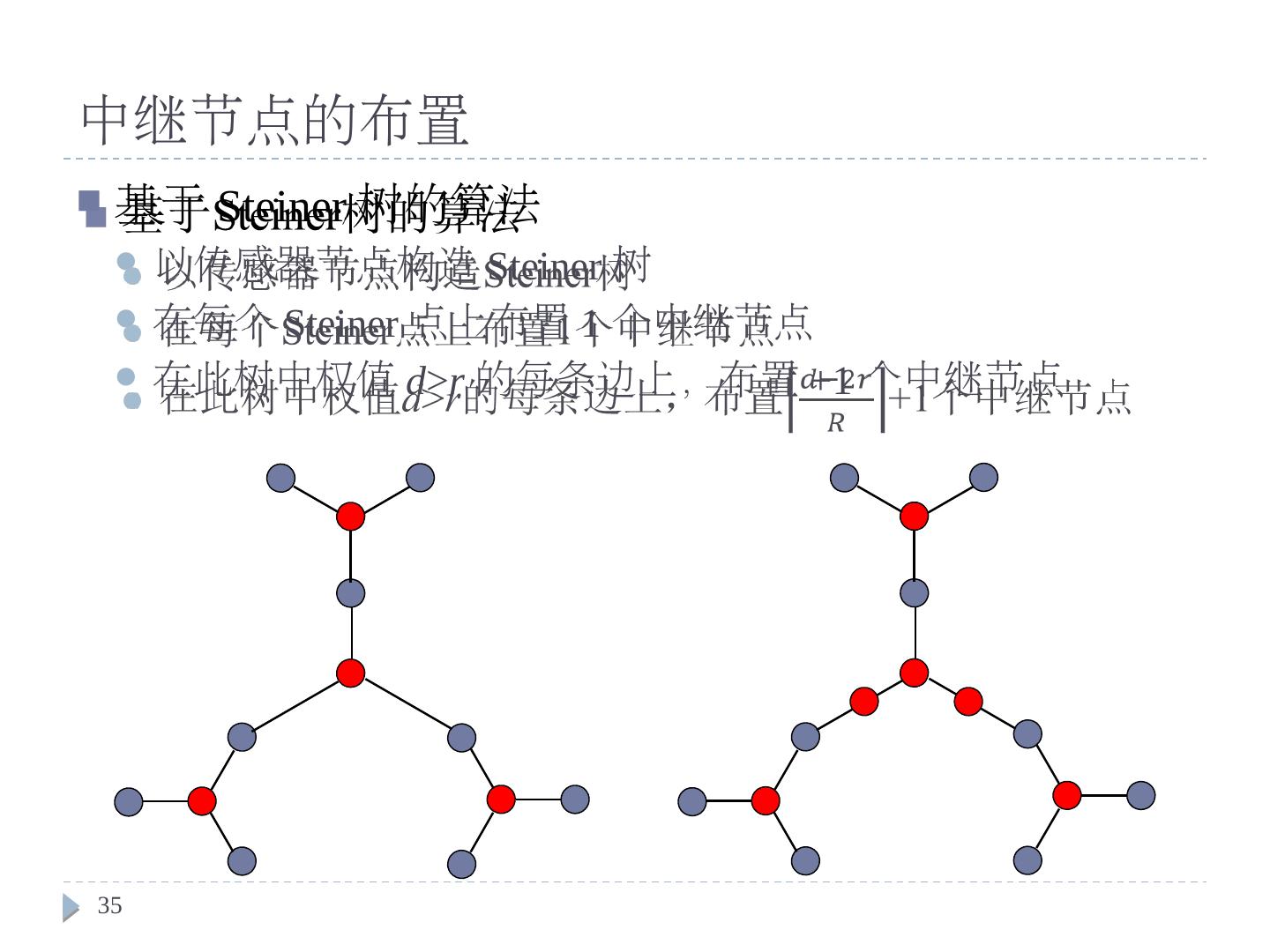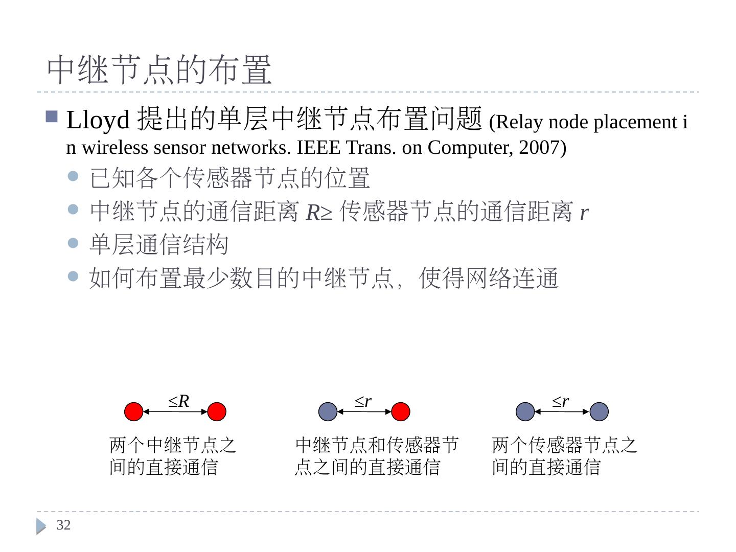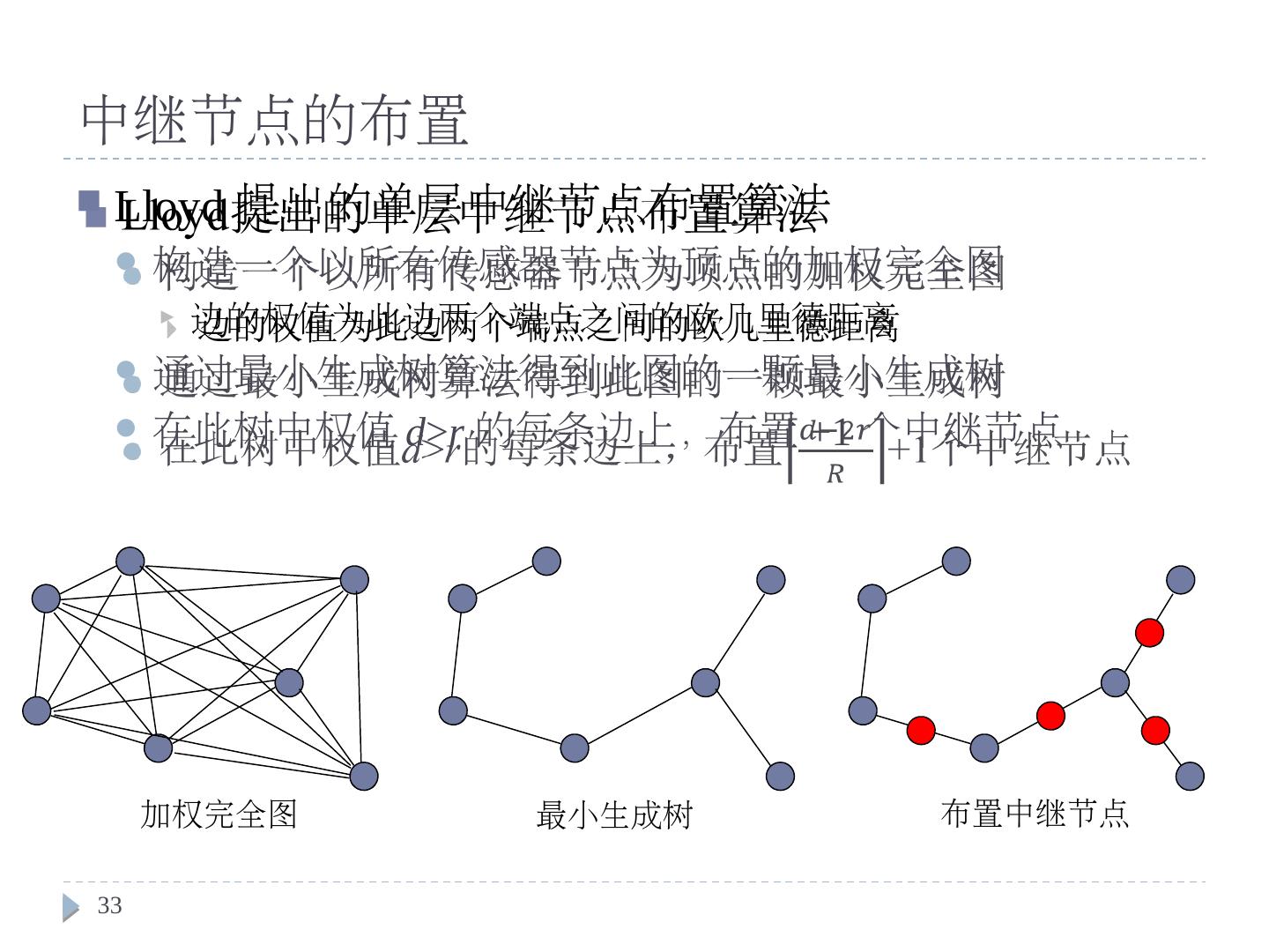 基于Steiner树的算法. 基于最小生成树的算法. 中继节点的布置. 更多的问题. 单层网络中的容错中继节点布置问题. 由传感器节点和中继节点组成的单层网络是k连通 ...
