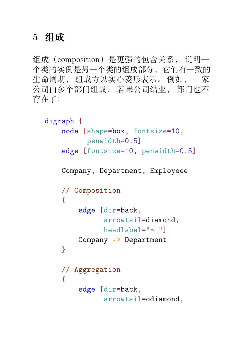 8 .5 组成 组成(composition)是更强的包含关系, 说明一 个类的实例是另一个类的组成部分,它们有一致的 生命周期, 组成方以实心菱形表示。 例如, 一家 公司由多个部门组成, 若果公司结业, 部门也不 存在了: digraph { node [shape=box, fontsize=10, penwidth=0.5] edge [fontsize=10, penwidth=0.5] Company, Department, Employeee // Composition { edge [dir=back, arrowtail=diamond, headlabel="* "] Company -> Department } // Aggregation { edge [dir=back, arrowtail=odiamond,