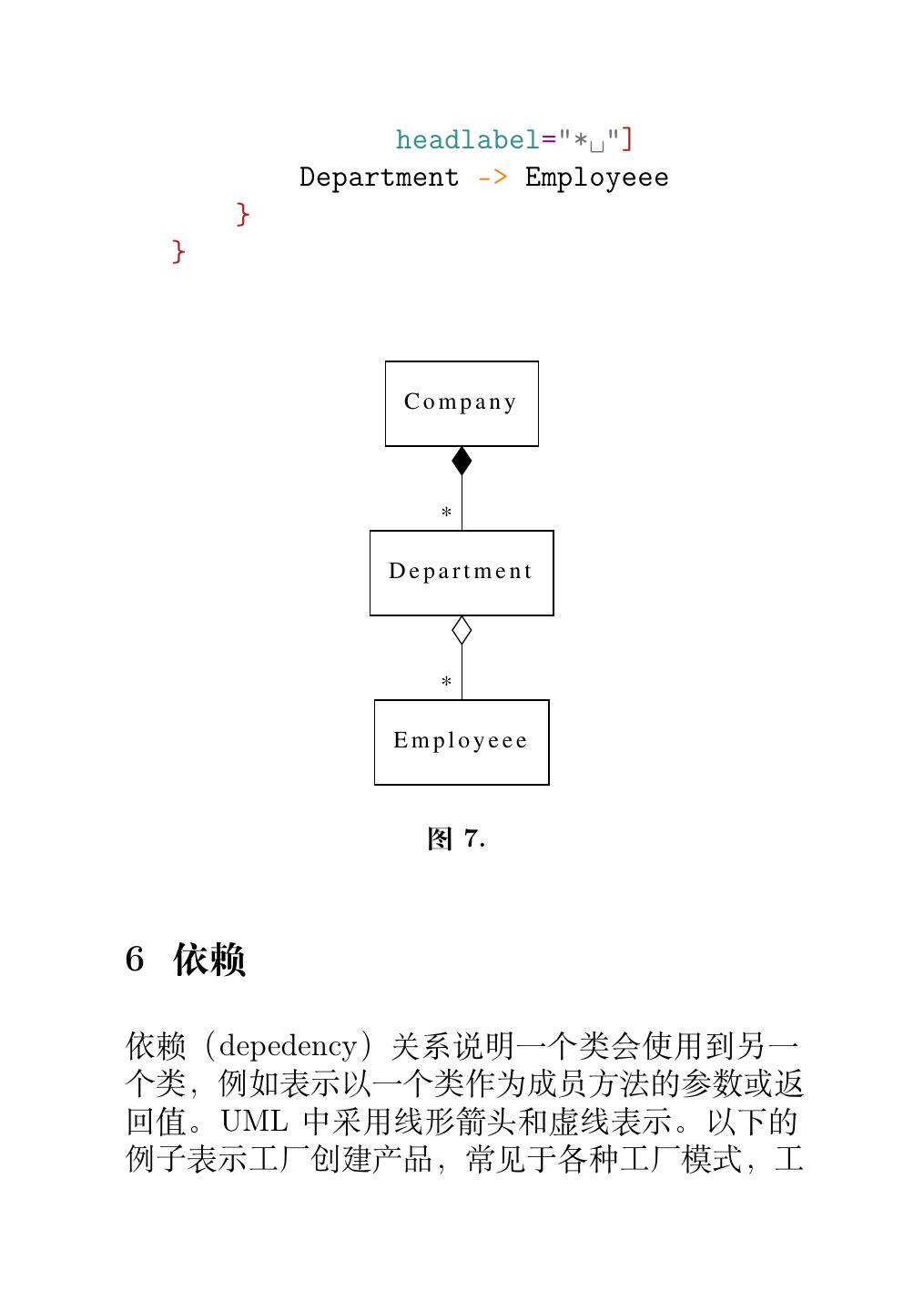 7 .个部门含有一些员工: digraph { node [shape=box, fontsize=10, penwidth=0.5] edge [fontsize=10, penwidth=0.5] Department, Employee /* Aggregation */ { edge [dir=back, arrowtail=odiamond, headlabel="* "] Department -> Employee } } Department * Employee 图 6.