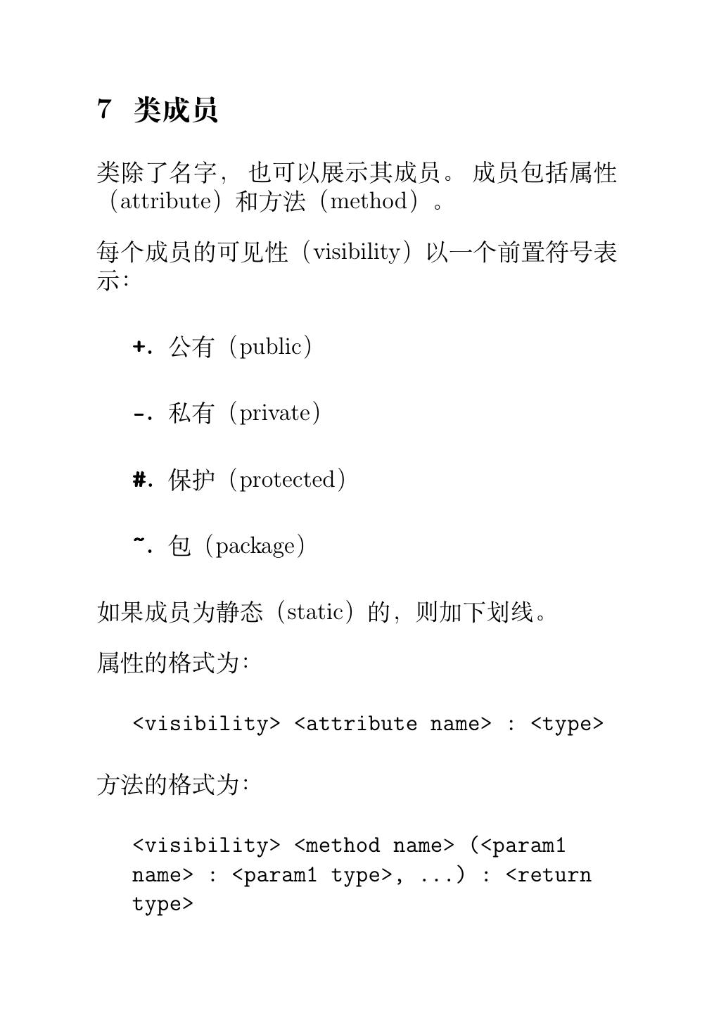 11 .7 类成员 类除了名字, 也可以展示其成员。 成员包括属性 (attribute)和方法(method)。 每个成员的可见性(visibility)以一个前置符号表 示: + . 公有(public) - . 私有(private) # . 保护(protected) ~ . 包(package) 如果成员为静态(static)的,则加下划线。 属性的格式为: <visibility> <attribute name> : <type> 方法的格式为: <visibility> <method name> (<param1 name> : <param1 type>, ...) : <return type>