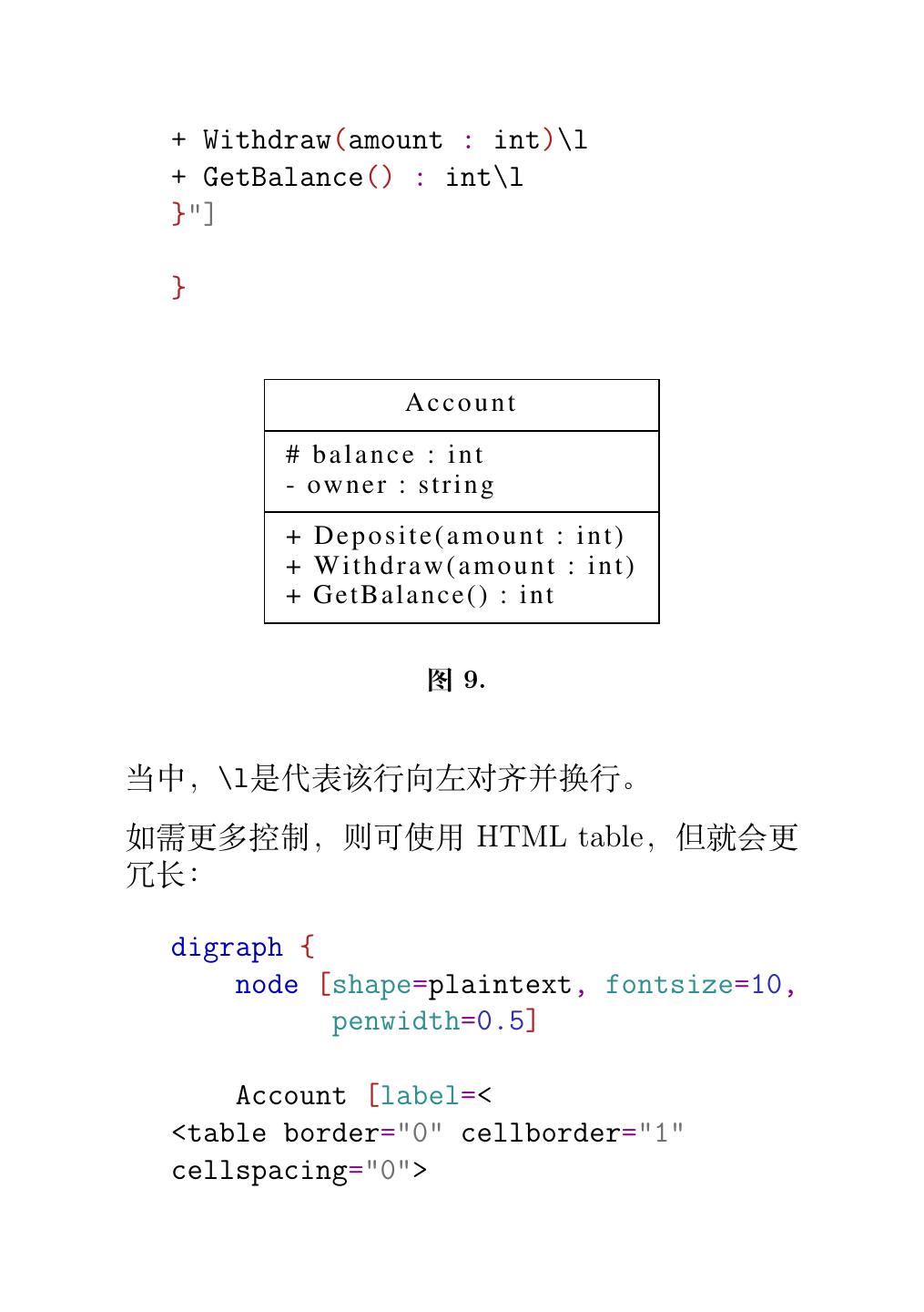 13 . + Withdraw(amount : int)\l + GetBalance() : int\l }"] } Account # balance : int - owner : string + Deposite(amount : int) + Withdraw(amount : int) + GetBalance() : int 图 9. 当中,\l是代表该行向左对齐并换行。 如需更多控制,则可使用 HTML table,但就会更 冗长: digraph { node [shape=plaintext, fontsize=10, penwidth=0.5] Account [label=< <table border="0" cellborder="1" cellspacing="0">