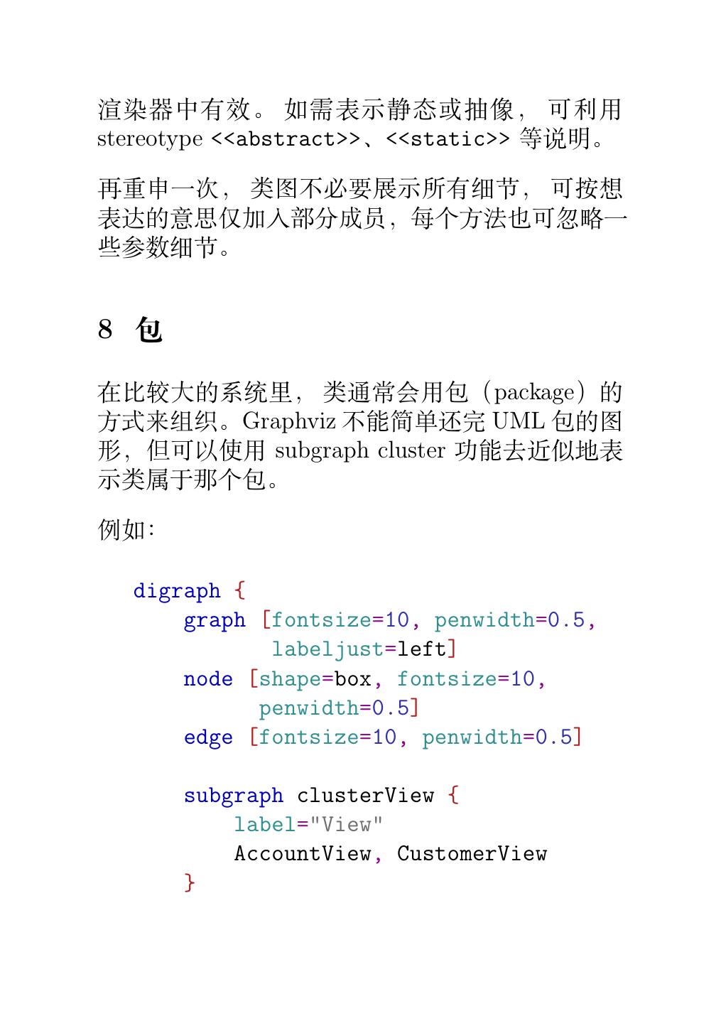 15 .渲染器中有效。 如需表示静态或抽像, 可利用 stereotype <<abstract>>、<<static>> 等说明。 再重申一次, 类图不必要展示所有细节, 可按想 表达的意思仅加入部分成员,每个方法也可忽略一 些参数细节。 8 包 在比较大的系统里, 类通常会用包(package)的 方式来组织。Graphviz 不能简单还完 UML 包的图 形,但可以使用 subgraph cluster 功能去近似地表 示类属于那个包。 例如: digraph { graph [fontsize=10, penwidth=0.5, labeljust=left] node [shape=box, fontsize=10, penwidth=0.5] edge [fontsize=10, penwidth=0.5] subgraph clusterView { label="View" AccountView, CustomerView }