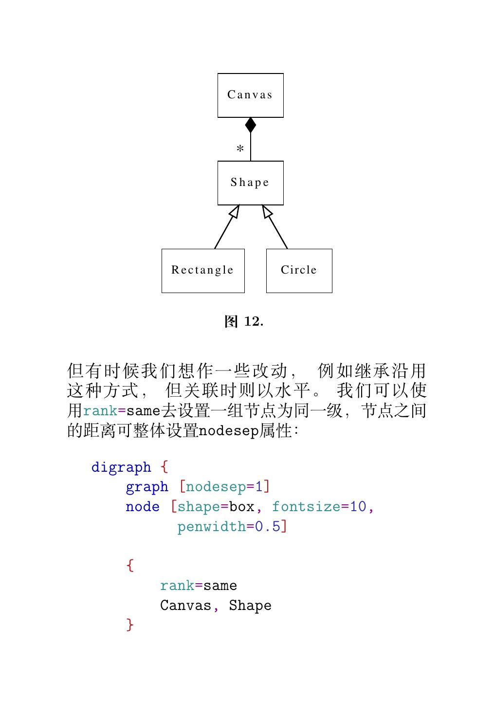 18 . Canvas * Shape Rectangle Circle 图 12. 但有时候我们想作一些改动, 例如继承沿用 这种方式, 但关联时则以水平。 我们可以使 用rank=same去设置一组节点为同一级,节点之间 的距离可整体设置nodesep属性: digraph { graph [nodesep=1] node [shape=box, fontsize=10, penwidth=0.5] { rank=same Canvas, Shape }