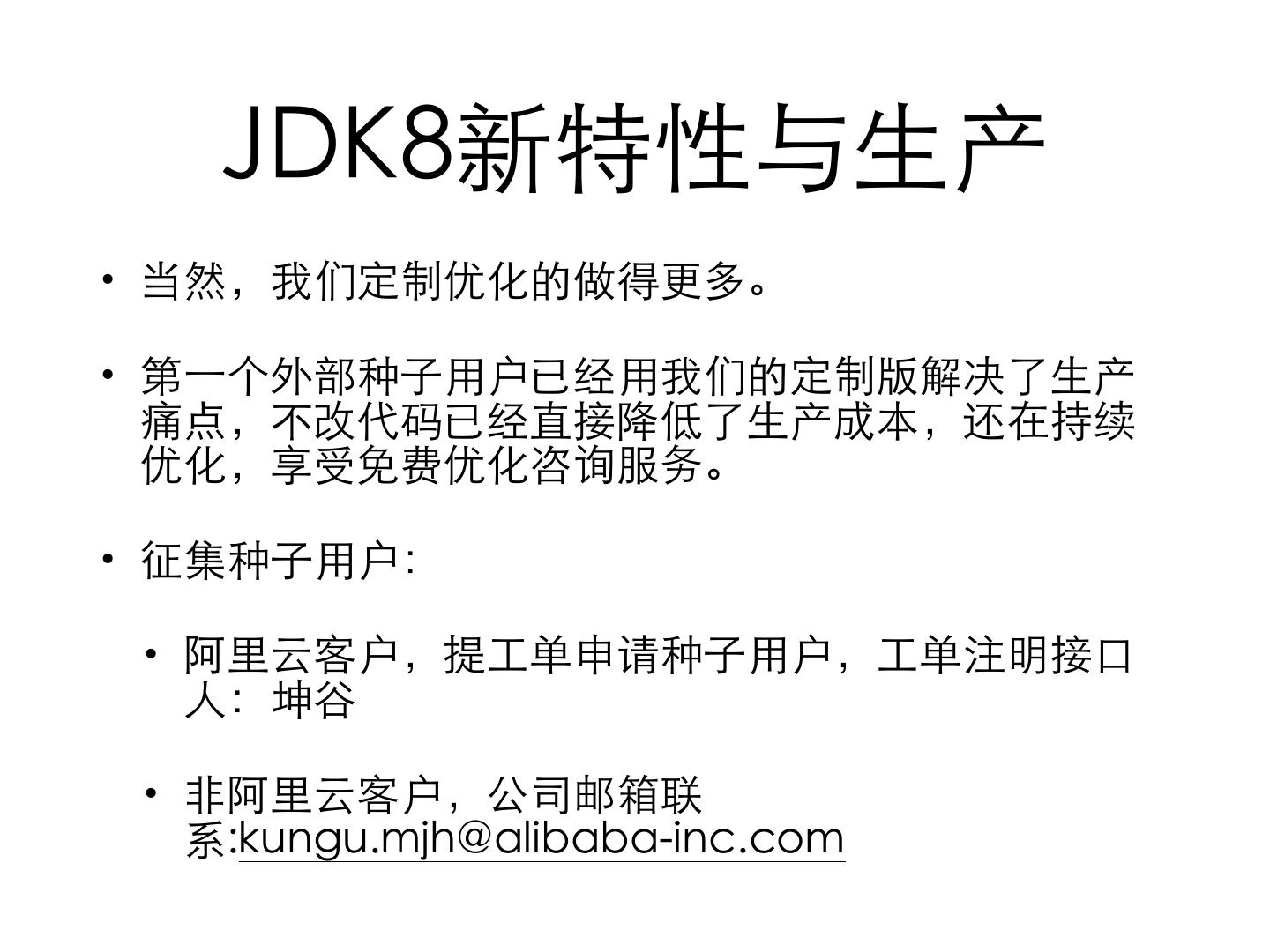 7 . JDK8新特性与⽣产 • 当然,我们定制优化的做得更多。 • 第⼀个外部种⼦⽤户已经⽤我们的定制版解决了⽣产 痛点,不改代码已经直接降低了⽣产成本,还在持续 优化,享受免费优化咨询服务。 • 征集种⼦⽤户: • 阿⾥云客户,提⼯单申请种⼦⽤户,⼯单注明接⼝ ⼈:坤⾕ • ⾮阿⾥云客户,公司邮箱联 系:kungu.mjh@alibaba-inc.com