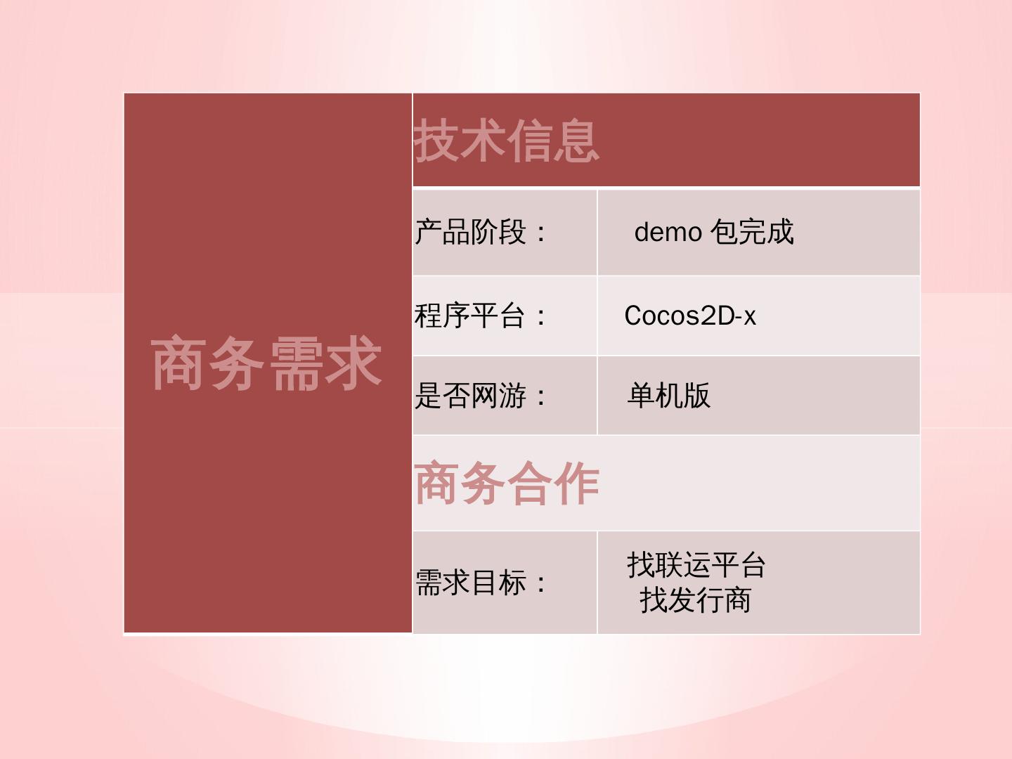 商务需求, 技术信息. 产品阶段:, demo包完成. 程序平台:, Cocos2D-x. 是否网游:, 单机版. 商务合作. 需求目标:, 找联运平台. 找发行商 ...