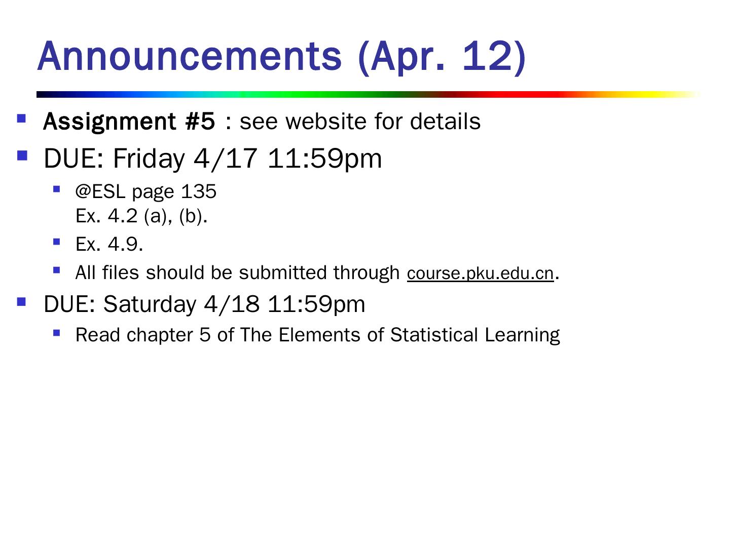 Read chapter 5 of The Elements of Statistical Learning. Announcements (Apr. 12). Chapter 3 Quiz @ISL. 3.1.R Why is linear regression ...