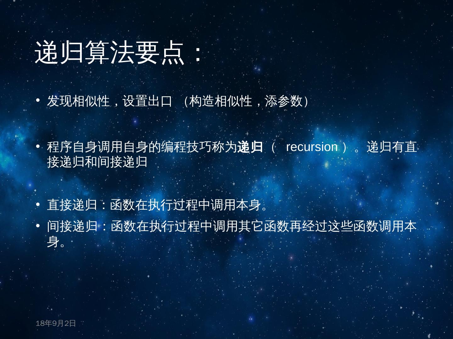 递归算法. 贪心算法. 搜索算法. 1/1/97. PART 01. 递归算法. 1/1/97. 递归算法要点:. 发现相似性,设置出口(构造相似性,添参数). 程序自身调用自身的编程技巧称为 ...